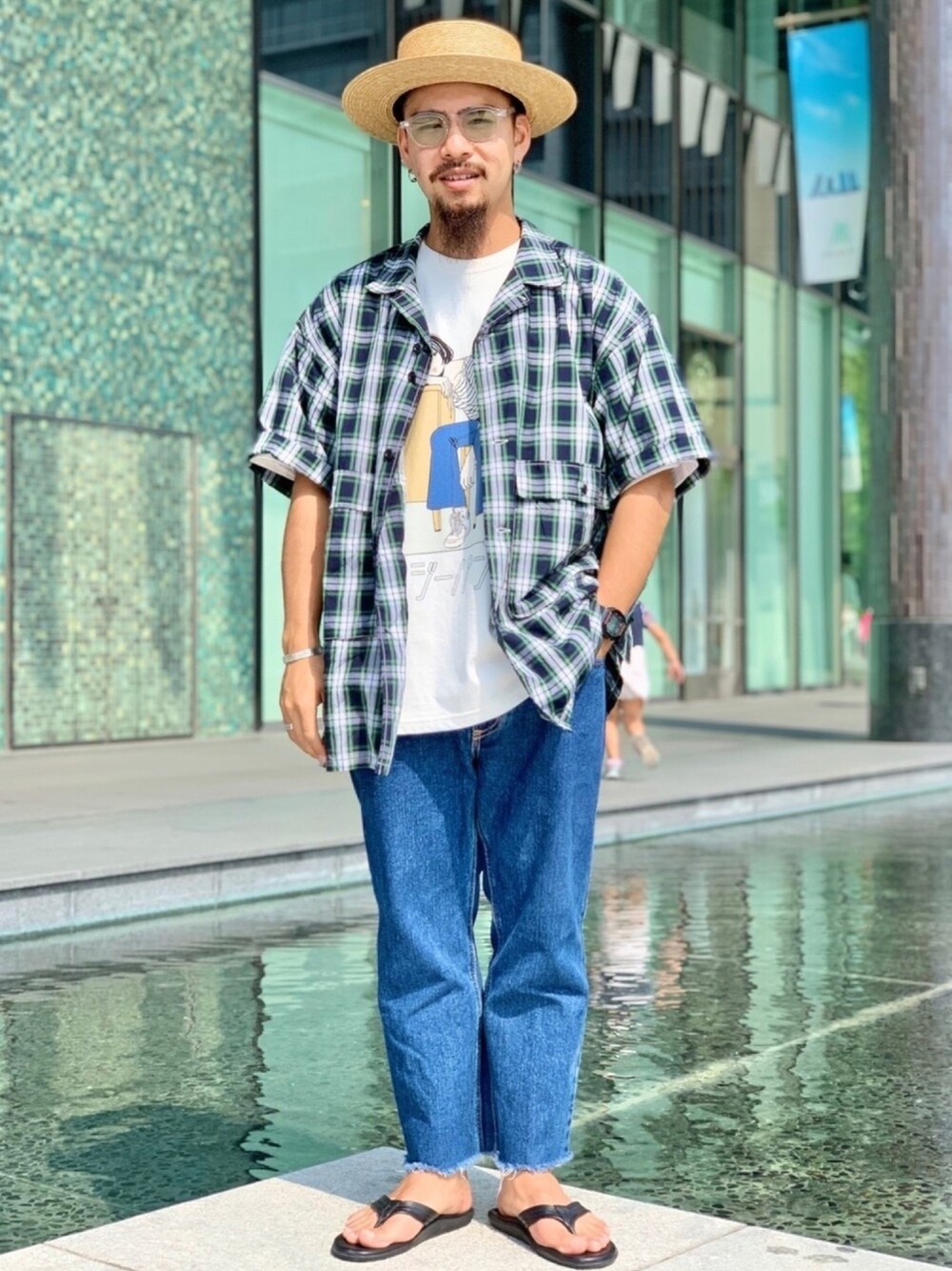チラリと覗く女の子がポイントです。 ボトムはぶった切りスタイル サンダルとの相性も抜群💎 トップスが大きめの場合はこのくらいの丈感がオススメ🕺🏾 デニムは店頭でも取り扱いあるのでお問い合わせ下さい。 instagram→@bbbbb0514
