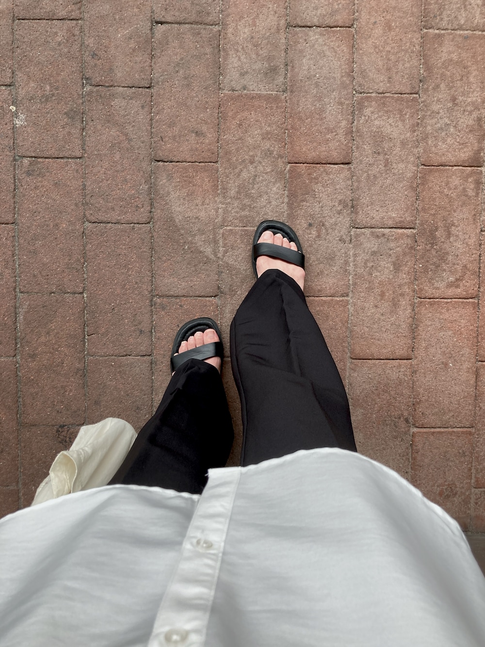 今日の足元 ハシゴレースチュニックブラウス S 2WAYストレッチフレアパンツ S ダブルベルトフラットサンダル S
