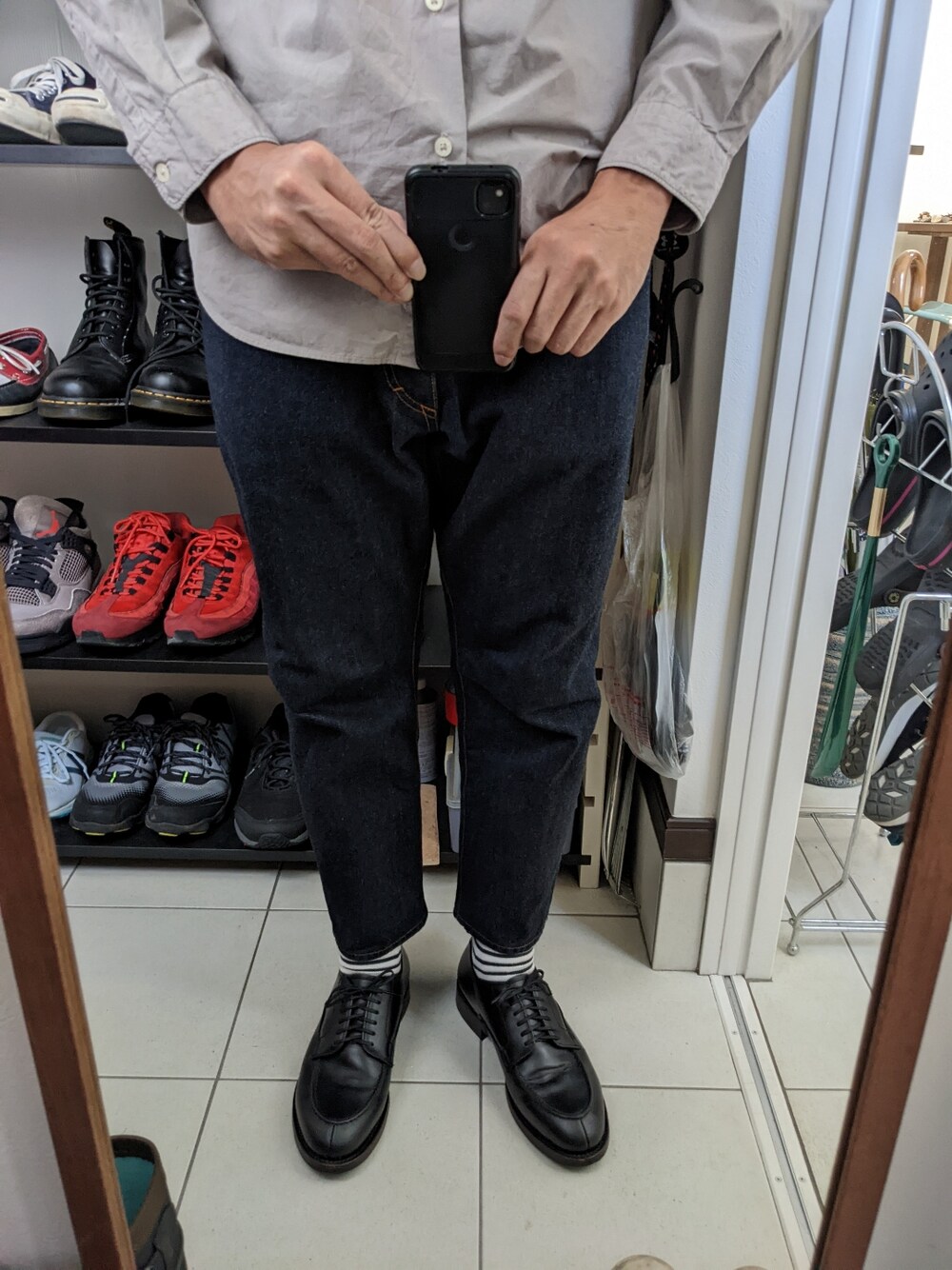 まだまだ暑いですがもう秋なので落ち着いた色味のコーデ。 トップスはグレーのバンドカラーシャツです。 ボーダーの靴下を見せてるのもポイントです。