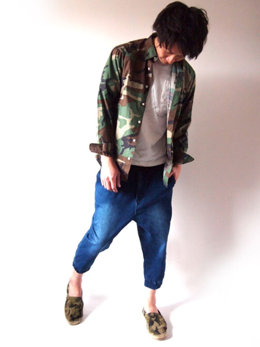 迷彩のシャツとエスパドリーユにストレッチデニムを使用したサルエルジョガーパンツの組み合わせ♪ 10/12にzozotown にBEATJIVE というメンズショップがOPENしました! レディースの方も着れるゆるアイテム多数ですので是非ご覧になって下さい。