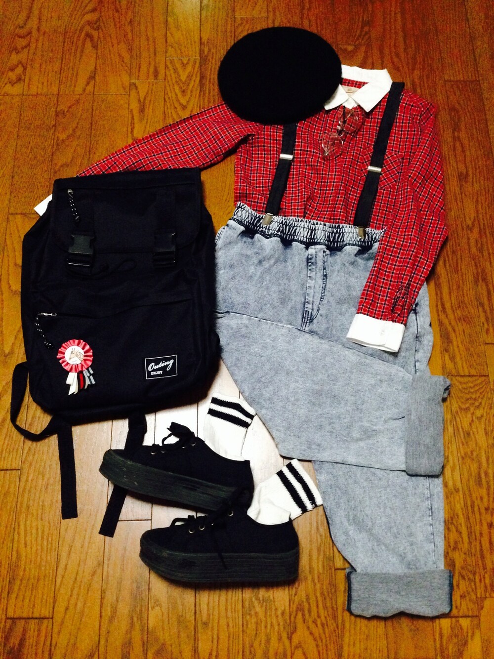 スクールボーイ風コーデです。 念願のKINJIで買ったシャツは外からボタンが見えない作りになってたり、秋真っ盛りな感じがしてだいすきです〜〜! デニムは、ほんとうにメンズものだったりします。