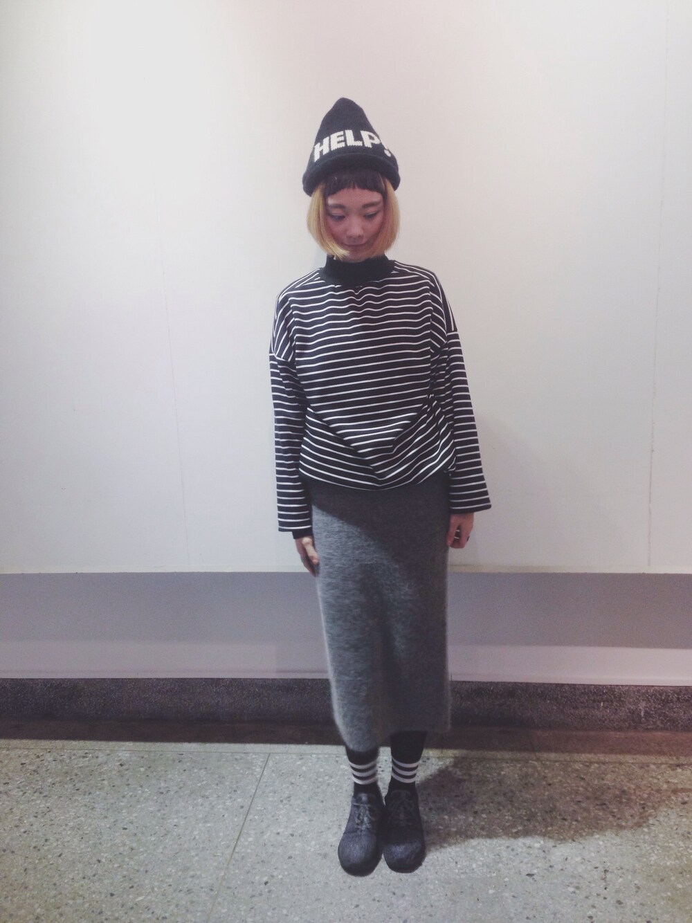 グレー系のスニーカーを着用したレディースの冬コーディネートの1枚目の写真