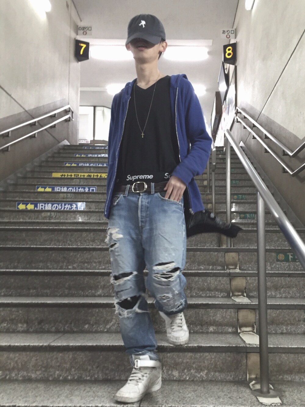 涼しかったのでパーカー羽織りました👍👍 ポイントはsupremeのボクサーパンツにTシャツをインすることです🙈 色味も青と黒を中心に揃えて気に入りました♡