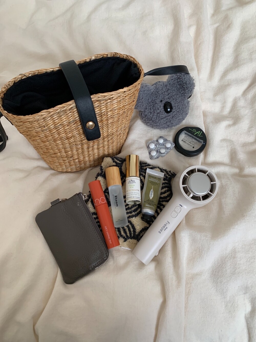 夏のバッグの中身🌻 このカゴバッグ、コンパクトなのに 意外と荷物がたっぷり入って お出かけにちょうどいいサイズ感なんです♡ コアラちゃんのポーチにはお出かけに欠かせない 目薬とお薬を入れています🐨🌿