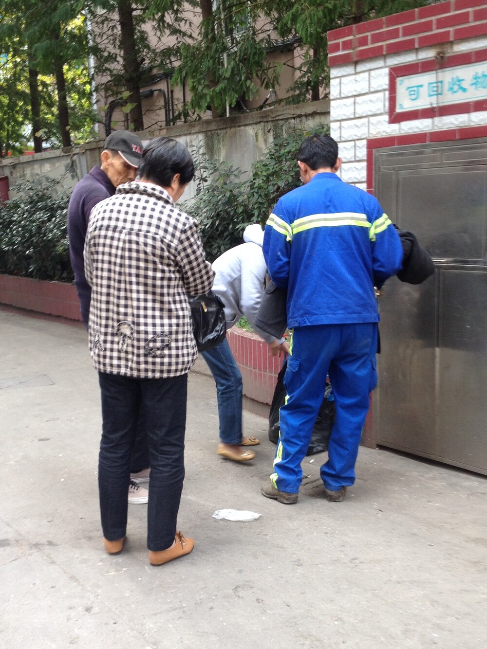 おばさんがおっさんに服をあげているところ