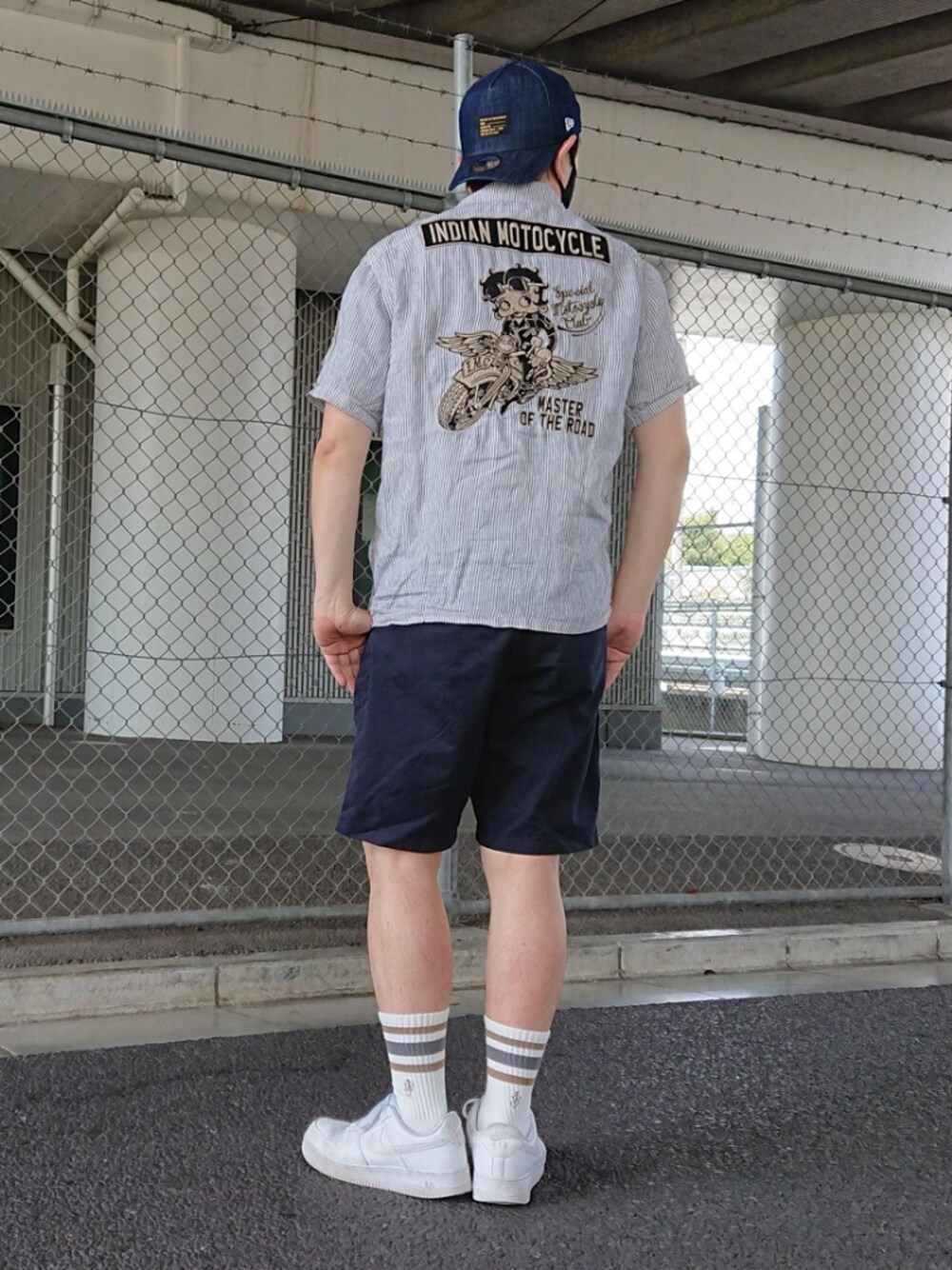 夏も終わりに近付き、半袖シャツを名残惜しんで着用しました。 INDIAN MOTORCYCLEのBETTY BOOPのシャツ。 シワが付きやすいので、アイロンが必要なのがたまにきず。 存在感があるので、ボトムスはユニクロで抑えました。
