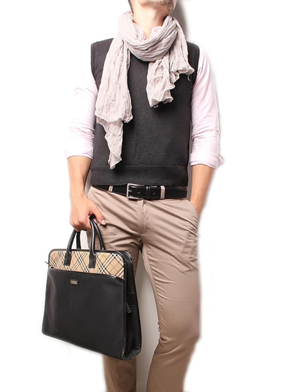 ブランド古着通販BBLSHOPです。 本日はBURBERRY BLACK LABELのチノパンツを使用したコーディネートをご紹介します。 淡いペイルトーンの中に濃いめの色のベストで全身を引き締め出来る男のスタイルを作り上げています。