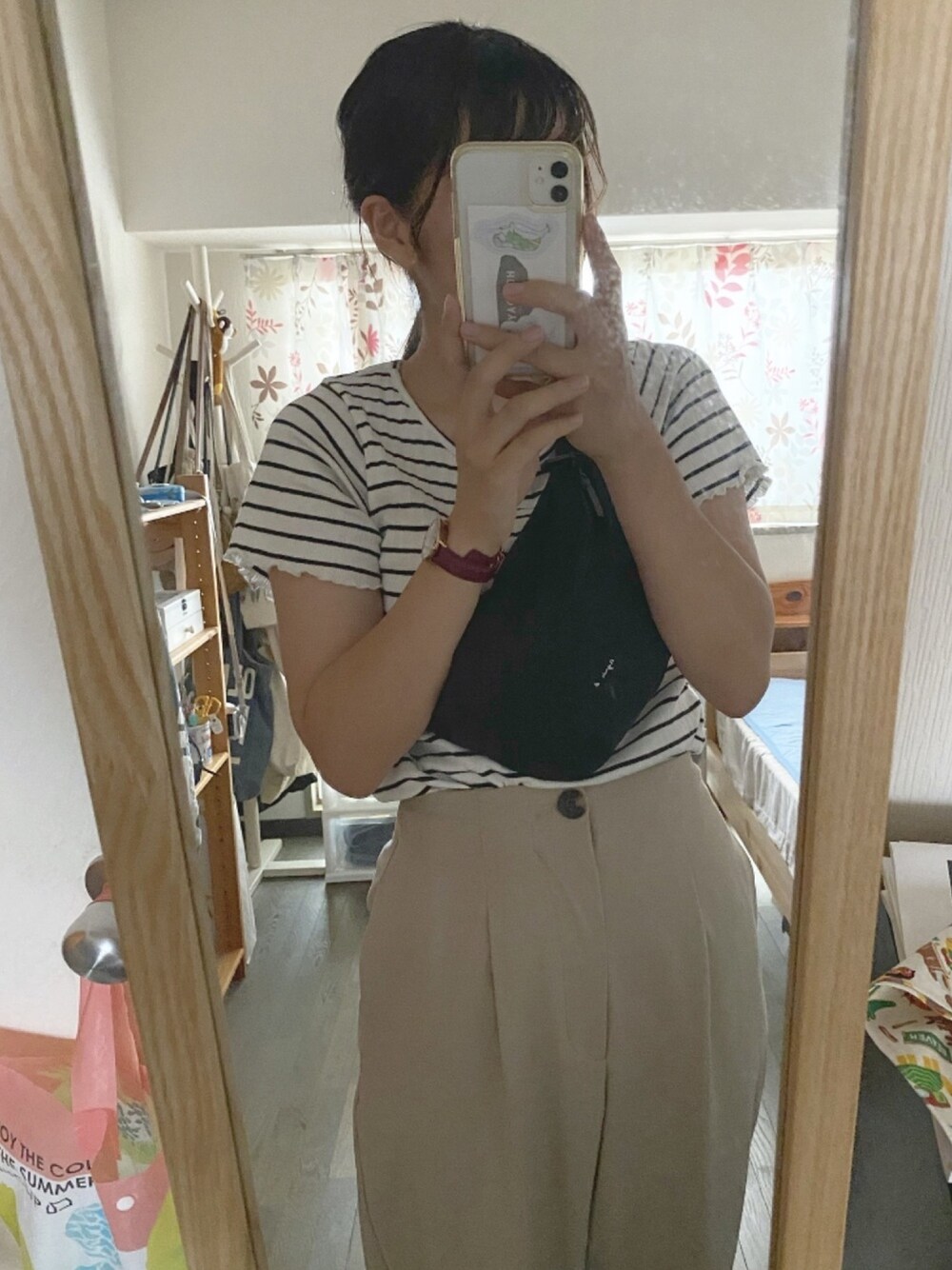08.13(木) コーデ 久しぶりに部屋取り!夕日が眩しすぎて上手に撮れなかった(笑) 今日からお盆なので4連休です✌🏻 おばあちゃん家にお墓参りコーデ〜 ボーダーって膨張色だからあんま着ないけど、 夏らしさはあるね〜🌻 袖がフリルなので可愛らしいです! SM2のセールで1,200円くらいで買いましたꪔ̤̬ 🎧あの頃のラヴソングは捨てて/Mr.ふぉるて