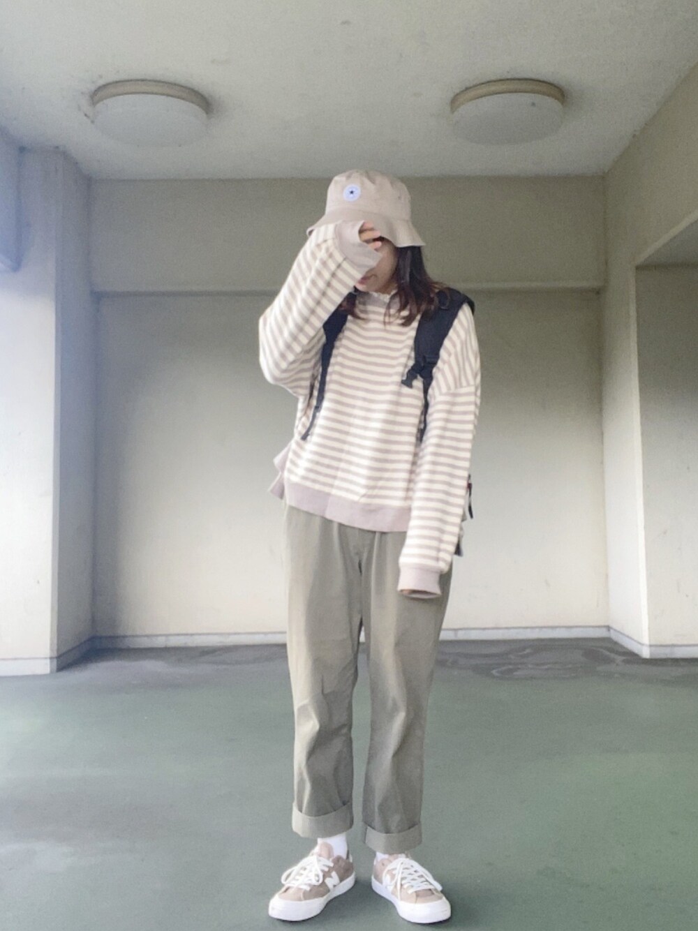 10.20(水) コーデ 今日はバケットハットがポイントです!! 初下ろし💆🏻 バケハが合うコーデってなかなか難しくて このコーデにたどり着くまで真剣悩んだ〜 検索かけたら、ゆるスウェットにパンツみたいな組み合わせが多くて、あり物で寄せてみた そしたら上下モスモスになったたまたま! 🎧遠恋列車/moon drop