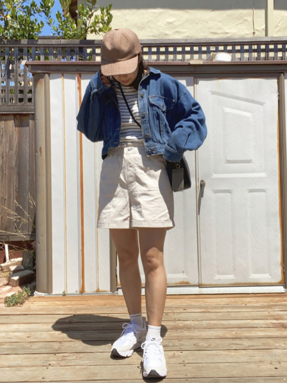 06.26 (土) コーデ 先月H&Mで見つけたドンピシャのハーフパンツ! 今日暖かくてやっと履けた🔅 このハーフパンツ、しっかり太ももカバーしてくれるし、 ベルト穴あるし、ウエストゴムやし、ポケットもついてて $13って破格すぎた…足は必死に角度詐欺✋🏻 ボーダー×デニムの最強コンビ〜 それに後ろがリボンのキャップも◎夏だねえ〜! ハーフパンツにこのごつめスニーカーがこれまたよく合う( ◜◡◝ )♡ 🎧kimi_no_egao/ヤユヨ