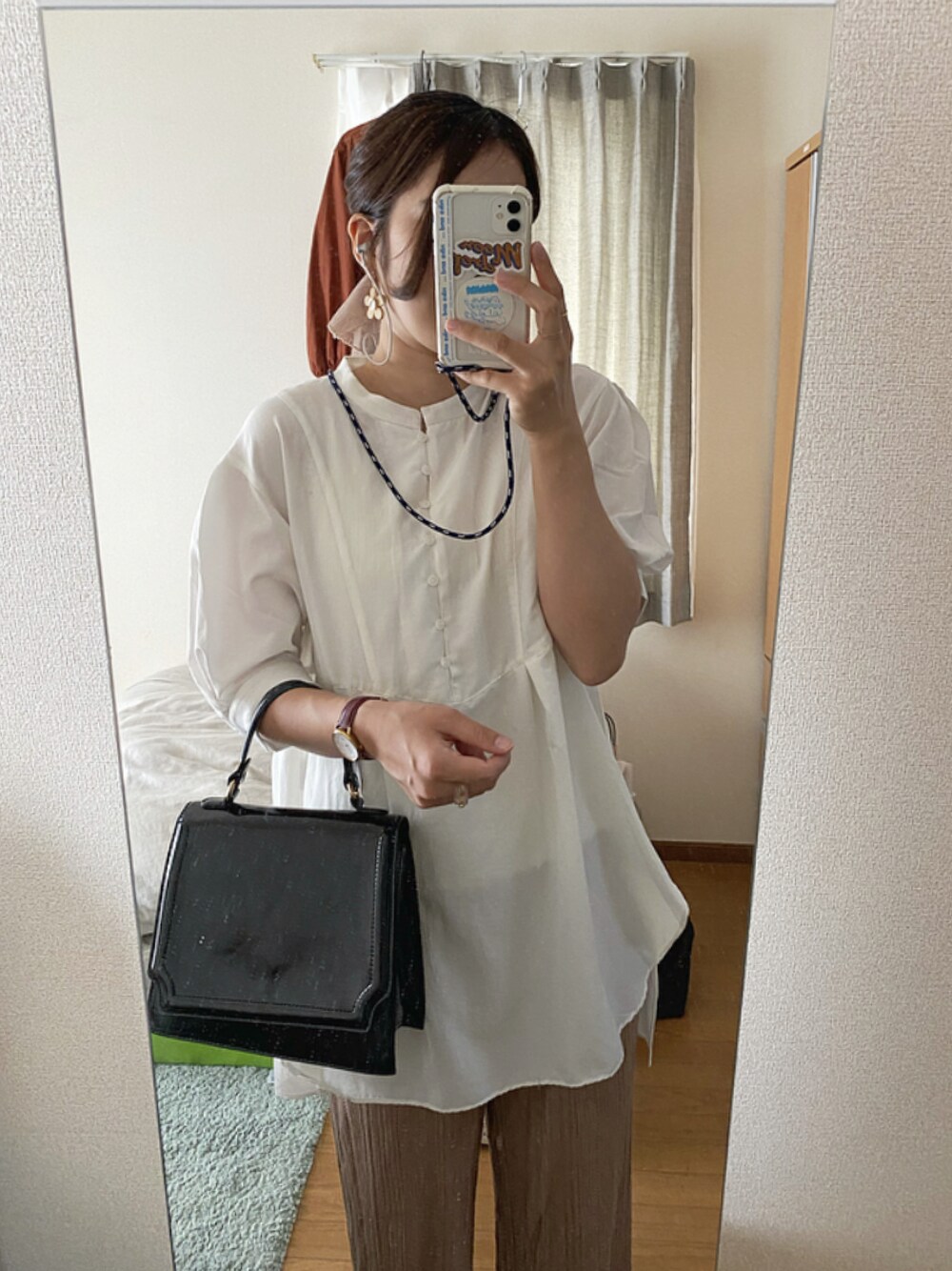 ema ¨̮ のシャツ/ブラウス「バンドネック後ろリボン半袖プルオーバー」を使ったコーディネート