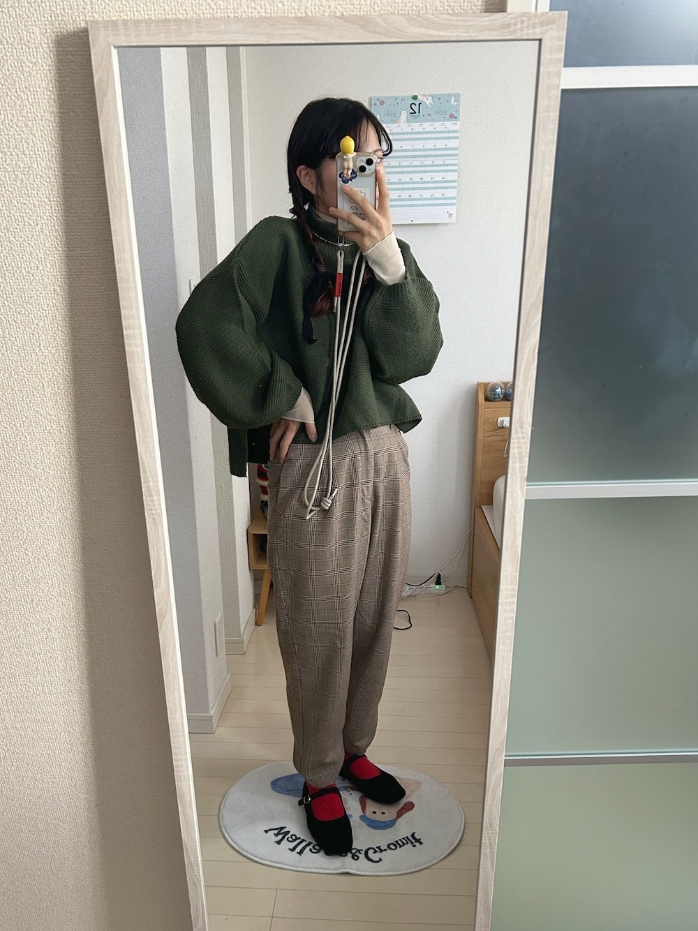 12/21(木) コーデ 友達と一年中Christmasなカフェに行った時のコーデです! GreenとRedでChristmas意識した^^ インナーのシアーシャツと三つ編みにリボンつけたのがポイント、可愛い 🎧常熱/Vaundy