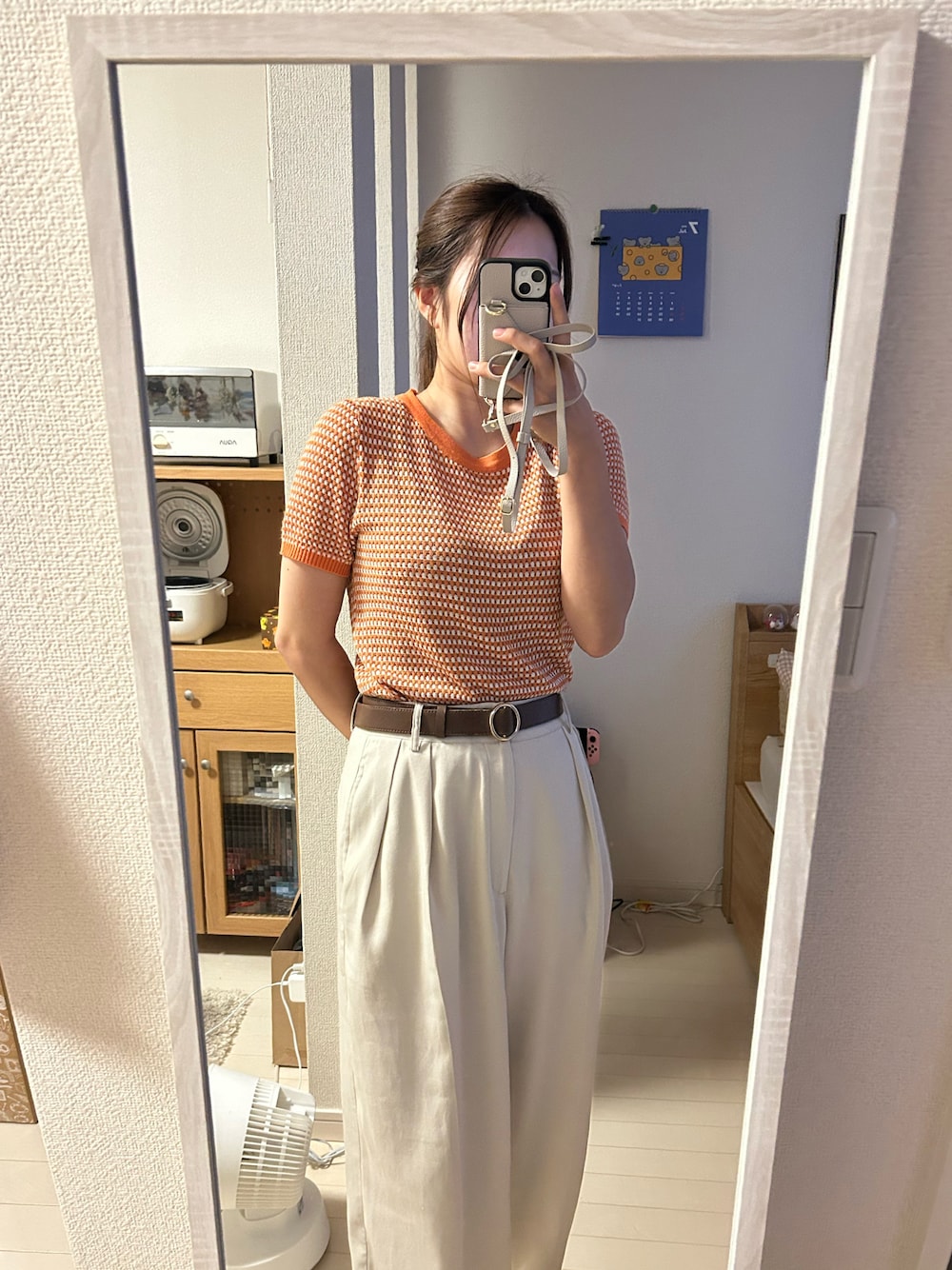 オレンジのサマーニット🍊 ホワイトのスラックスで明るめに૮ . ̫ . ა 金具が丸いベルトってなんかレトロ! バッグは写ってないけどマリクワです💐 🎧Lukewarm/さとうもか