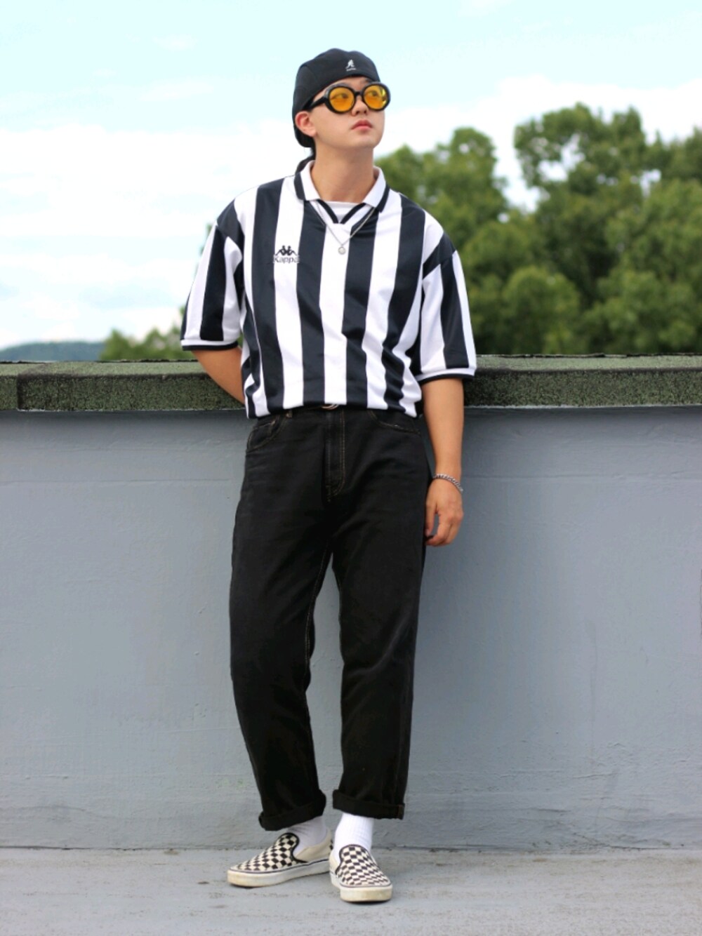 ホワイト系のスニーカー、ブラック系のTシャツ/カットソーを着用したメンズの夏コーディネートの1枚目の写真