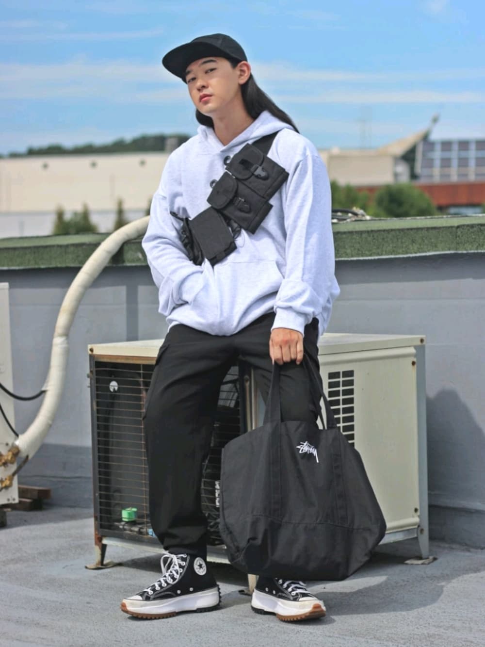 ブラック系のトートバッグを着用したメンズの秋コーディネートの1枚目の写真