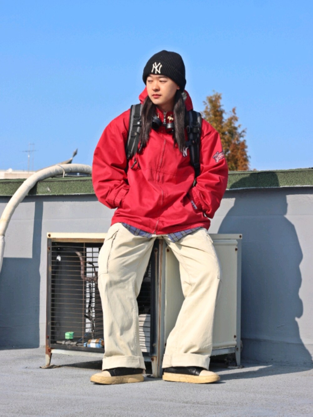 レッド系のジャケット/アウター、ホワイト系のデニムパンツを着用したメンズの秋コーディネートの1枚目の写真