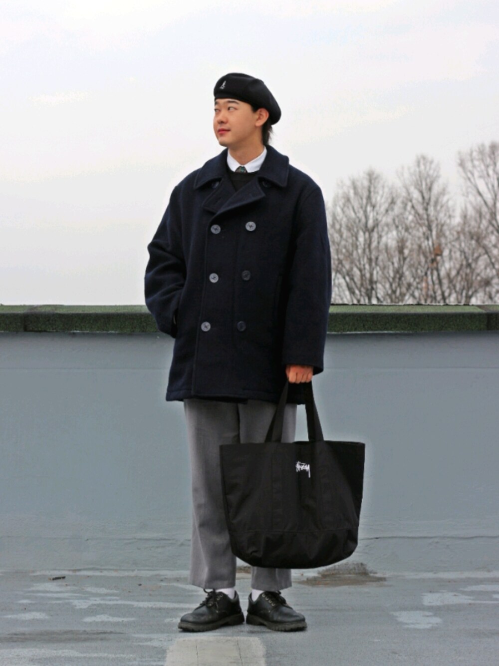 ブラック系のトートバッグを着用したメンズの冬コーディネートの1枚目の写真