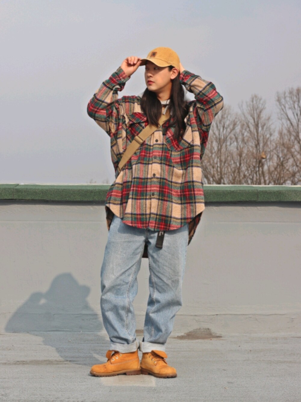 オレンジ系のスニーカーを着用したメンズの冬コーディネートの1枚目の写真