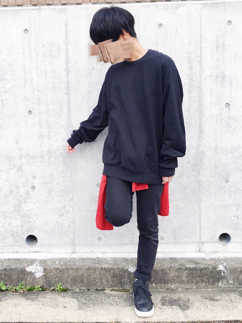 ▷S I Z E ・カットソー L ・パンツ 30 今回はスキニーにオーバーサイズなスウェットにシャツ腰巻でアクティブに☝️ 全体を黒に纏めて赤をポイントに。 台風やばかったですね。。。 朝通勤が大変でした🌀