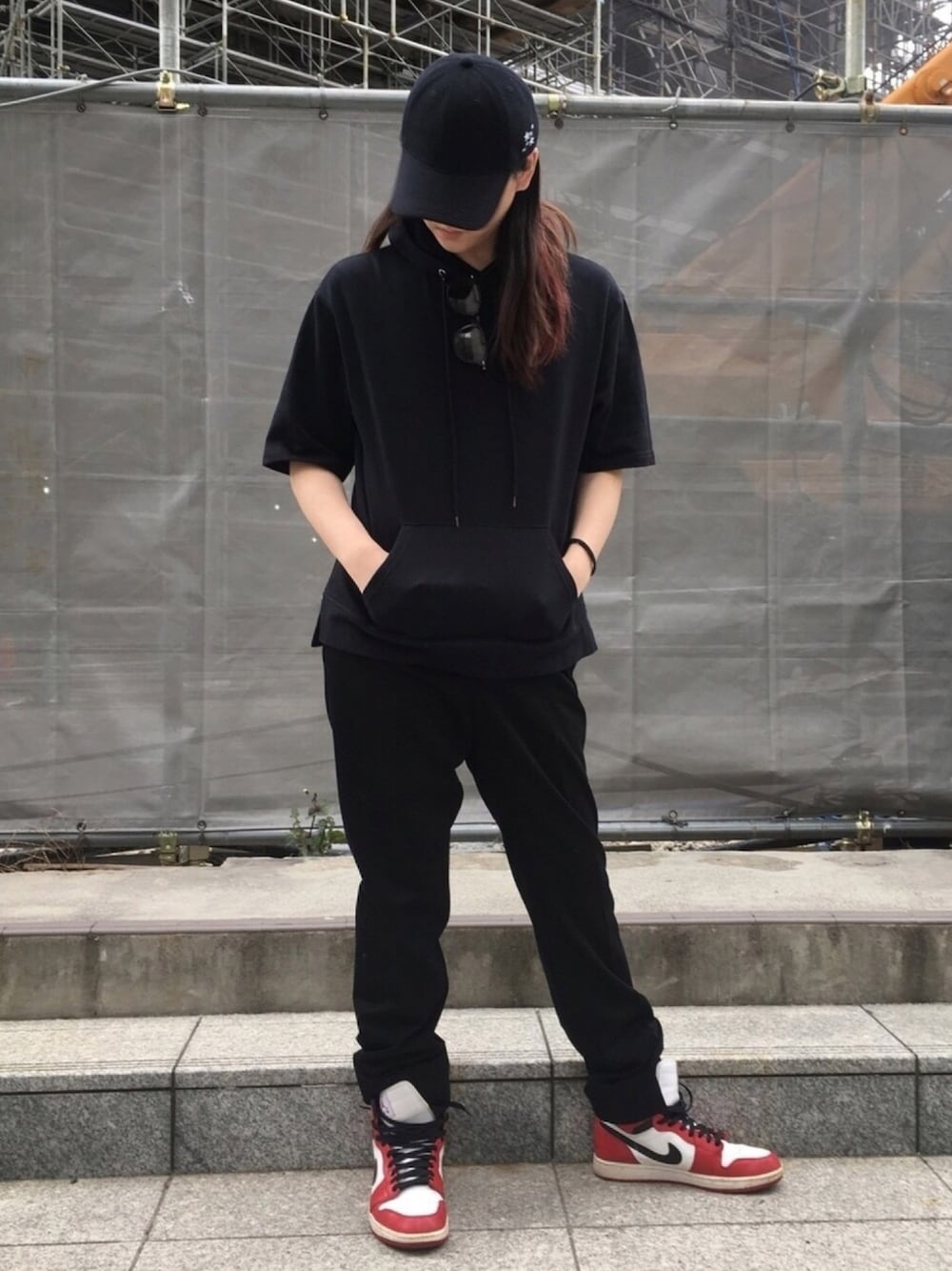 こんにちわ♪ 最近少し暖かくなってきましたね〜🌱 早速ですが、今日のスタイリングは、 程よい肉感★ミニ裏毛素材のBASECONTROLパーカーを使った、ブラックコーデになります‼️ 私、ブラックが大好きなんです★ 一部では、名探偵コ◯ンの犯人(あのシルエットの人ね)と呼ばれております😂 まぁ、靴まで黒いとガチな感じなので、シューズは赤ジョーダンにしてます笑