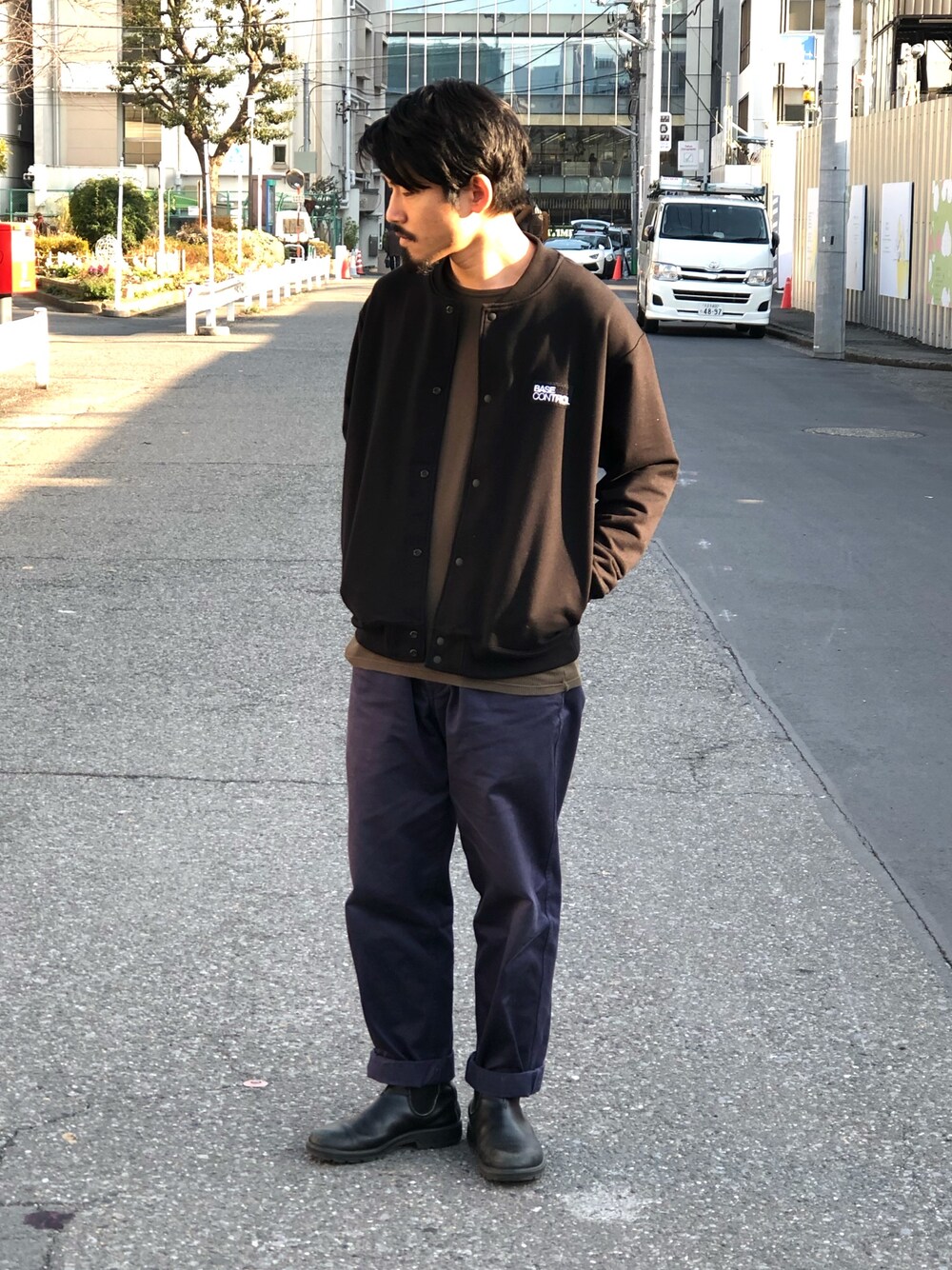 ストレッチの効いてる裏毛のスタジャンを主軸に、シンプルにスタイリング。 一枚着はもちろん、アウターのインナーとしても活躍します。