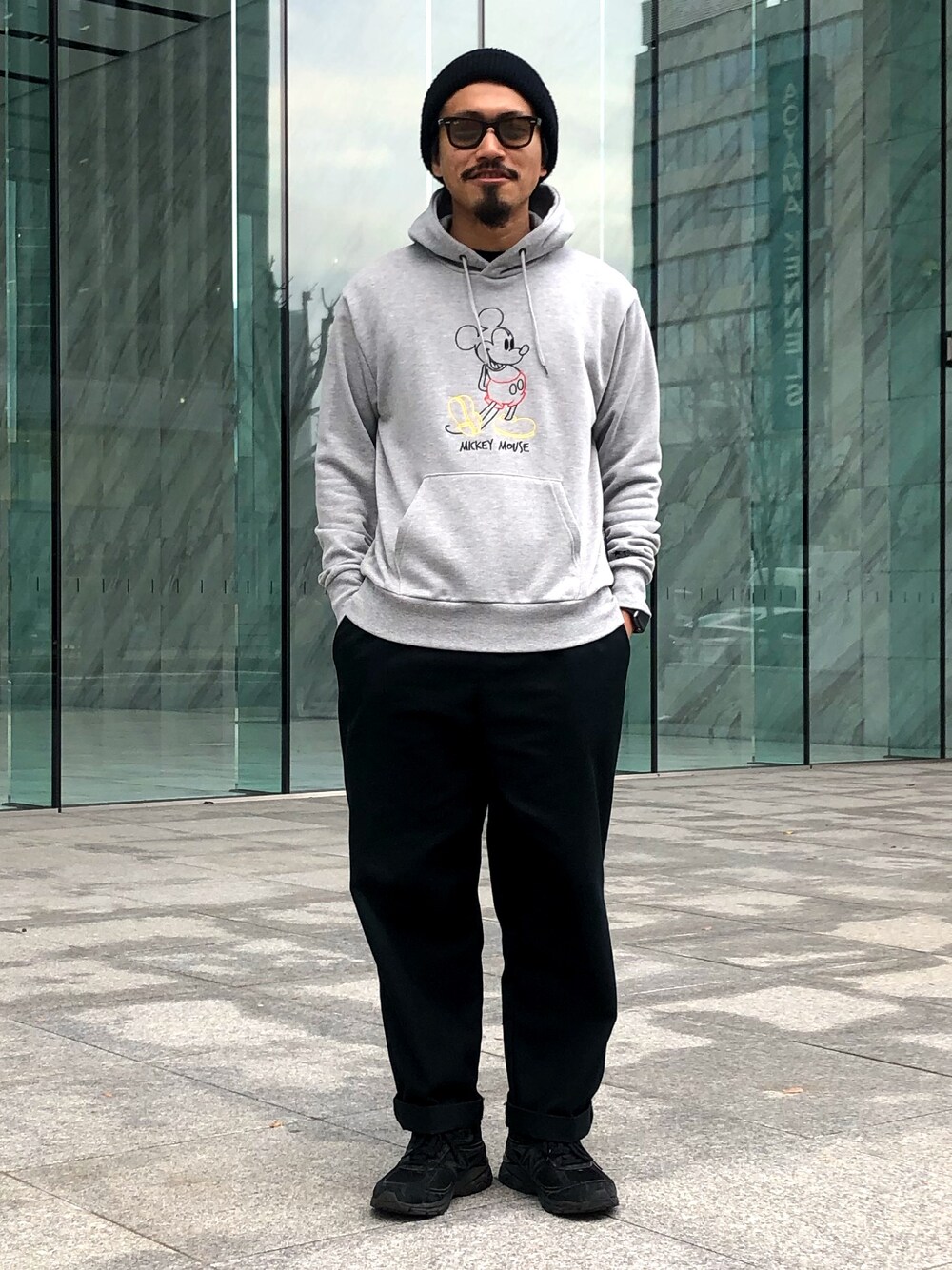 今日のコーデ ミッキーのパーカーをラフにシンプルにスタイリング