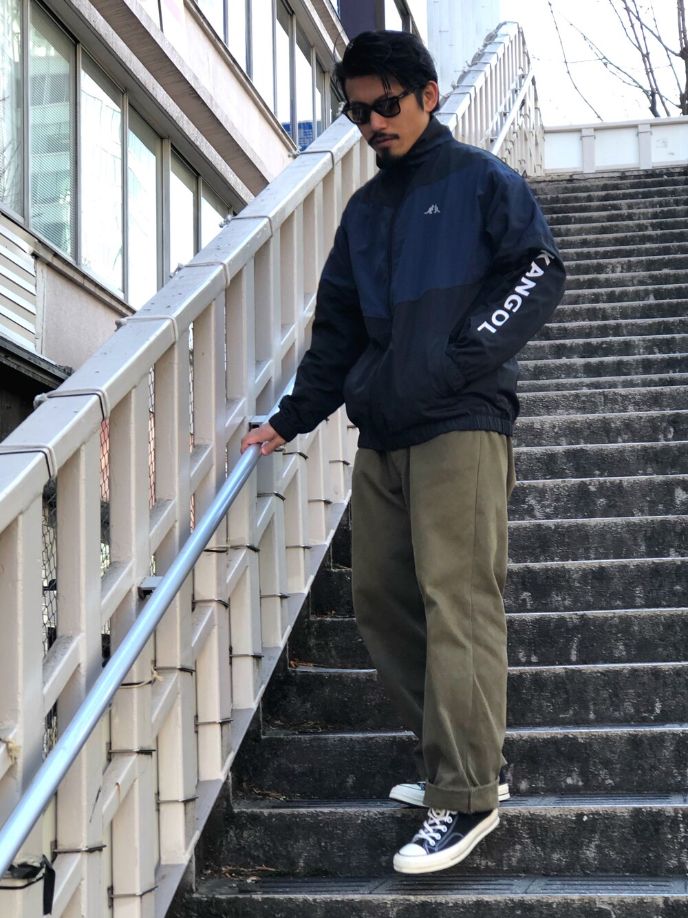 今日のコーデ カンゴールのトラックジャケット、ネイビーとブラックの切り替えが主張しすぎないワンポイントで使いやすいアイテムです。 これ一枚で今年らしい雰囲気になりますので、おススメです。 気軽にスポーツミックスやストリート感を取り入れて頂けます。