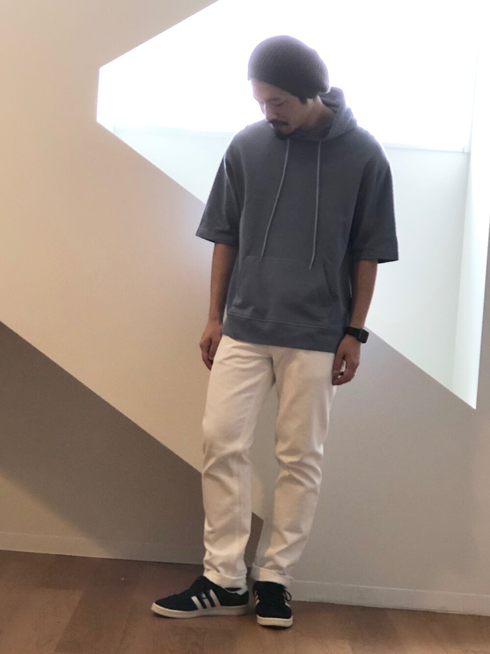 今日のコーデ あいにくの雨なので、室内で。 春夏らしいホワイトデニムを使用したスタイリングです。 ミニ裏毛素材の半袖パーカーは程よい肉感でこれからの季節に万能のアイテムです。 ビッグサイズでドロップショルダーとなりますので、こなれた雰囲気になりオススメです。