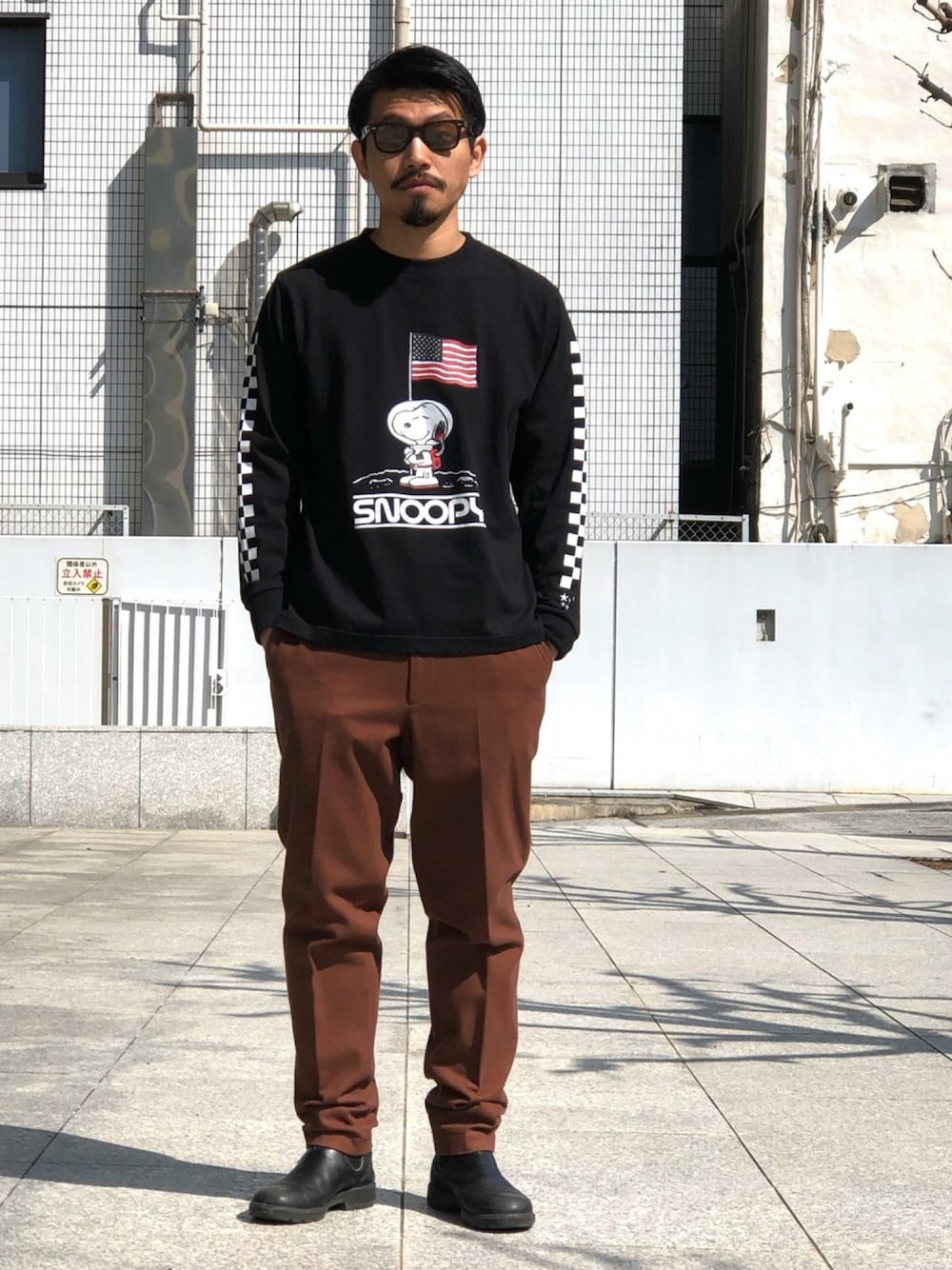 今日のコーデ USAフラッグのグラフィックがキャッチーなスヌーピーのロンTでクラシックに。 パンツの色味をブラウン系に、ブーツと合わせて少し大人な雰囲気にしてみました。