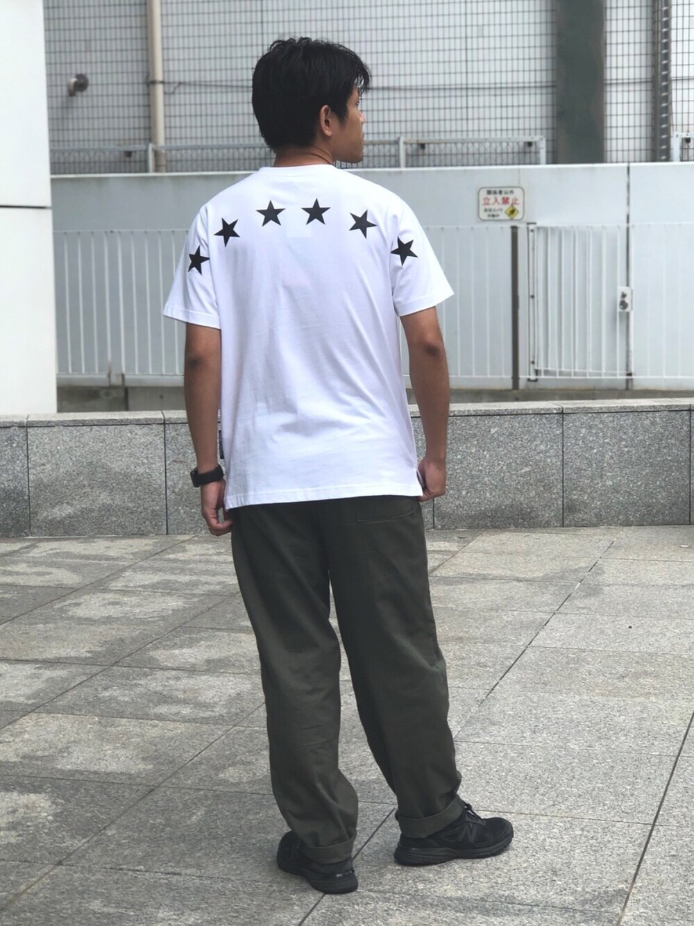 今日のコーデ 久しぶりの快晴ですね。 スターのバックプリントがインパクト大のプリントTシャツを主軸にコーディネートしました。 インパクト大のTシャツは今年らしくオススメです。