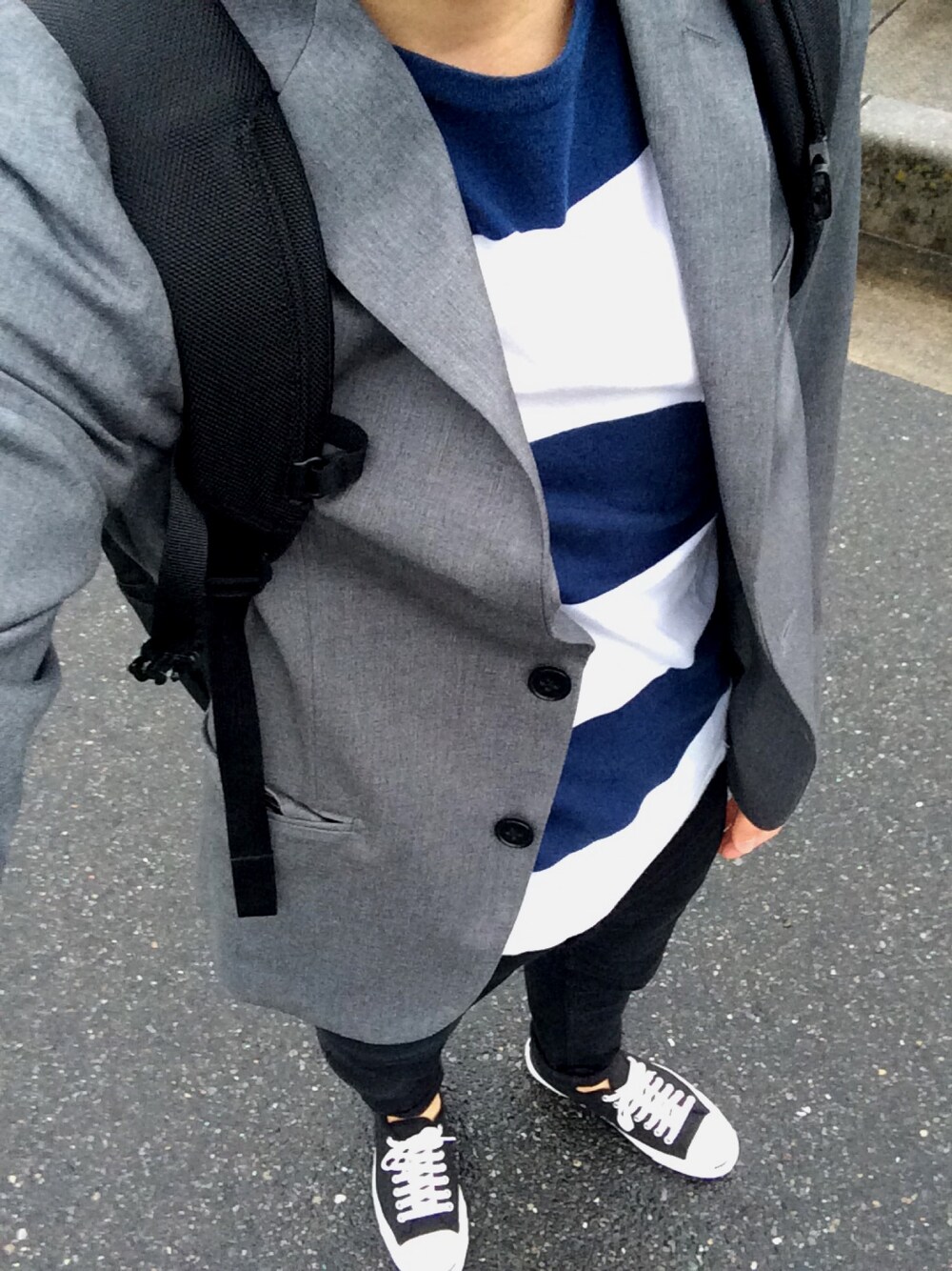 テーラードジャケットにバックパックな点…。 SaturdaysのボーダーTがお気に入り。
