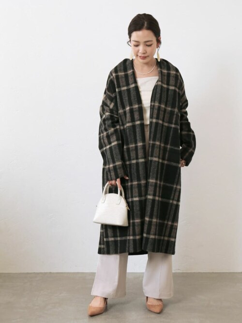 【ライトニットガウンコート】 秋から真冬のコートの出番までの間の季節で大活躍なガウンコートです!! とにかく軽くて柔らかい素材が特徴で、コート特有の重さは一切なく肩こりの心配もいりません。 ボタンやホックなど前を閉めるものは無くカーディガンのように気軽に羽織っていただけるようなデザインで、襟を少し後ろに抜いて着ていただくと襟元が少し立ち、女性らしさを演出してくれます!! 全体がチェックのデザインですが、茶色と黒ベースの全体が落ち着いたお色味なので挑戦しやすいかなと思います!! サイズ感は身長157cmで膝下までくる丈感で腕周りはゆったりとしていて厚手のスエットなどでも合わせていただけるようなお作りになっています!! ✴︎身長:157cm 普段サイズ:S〜M 着用サイズ:フリー