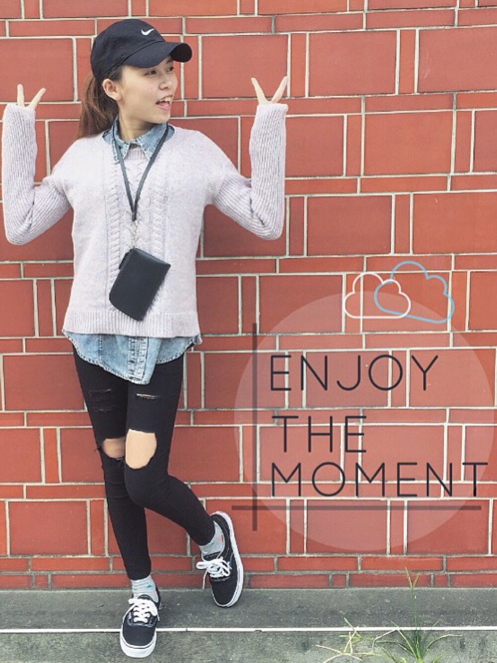 ブラック系のスニーカー、パープル系のワンピース/ドレス、ブラック系のキャップを着用したレディースの冬コーディネートの1枚目の写真