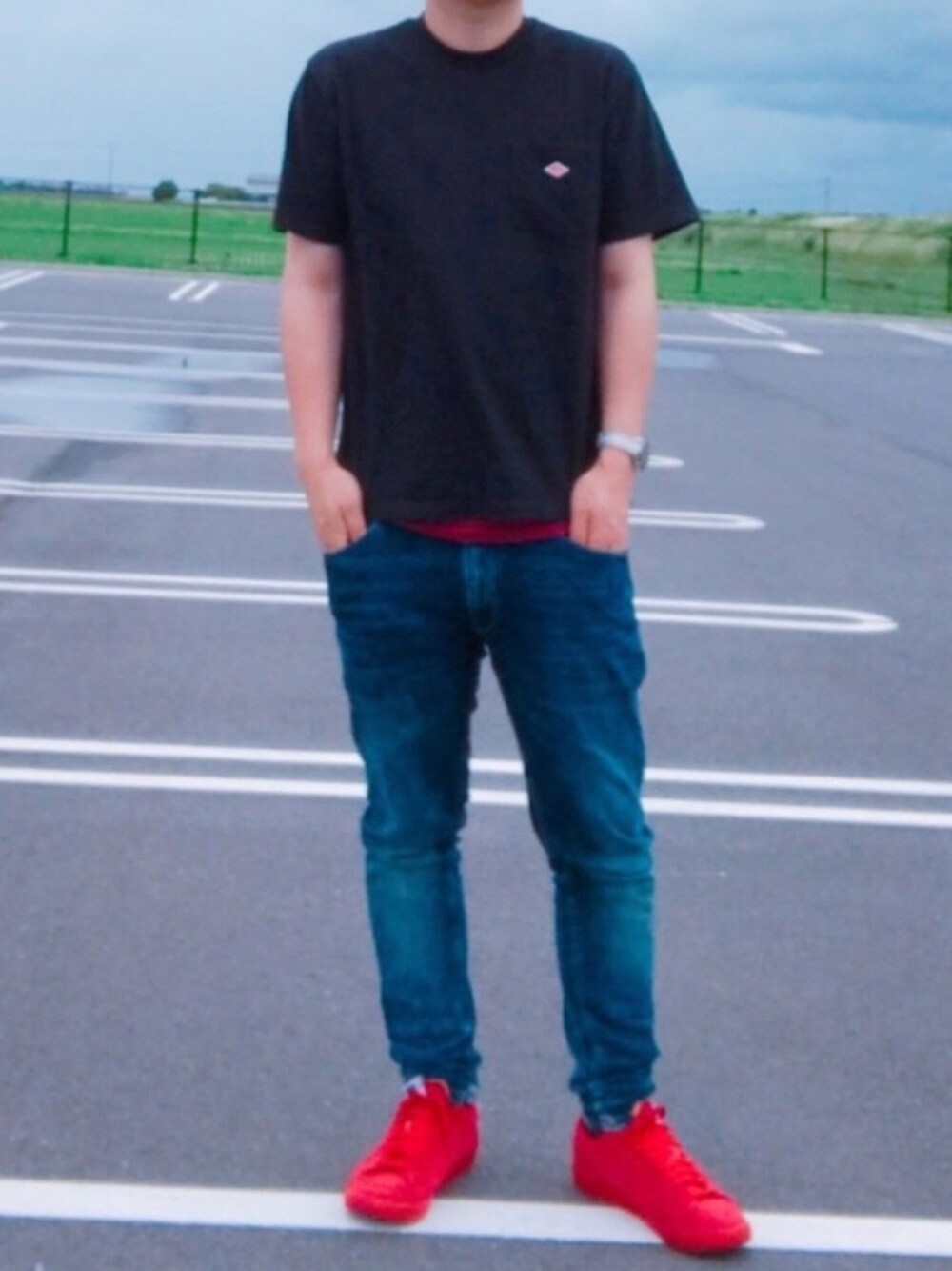 シンプルコーデ!! 差し色に赤いニットキャップ、赤いインナー、赤い靴(^ ^) いつも閲覧ありがとうございます😊 いいね、フォローお願いします🤲