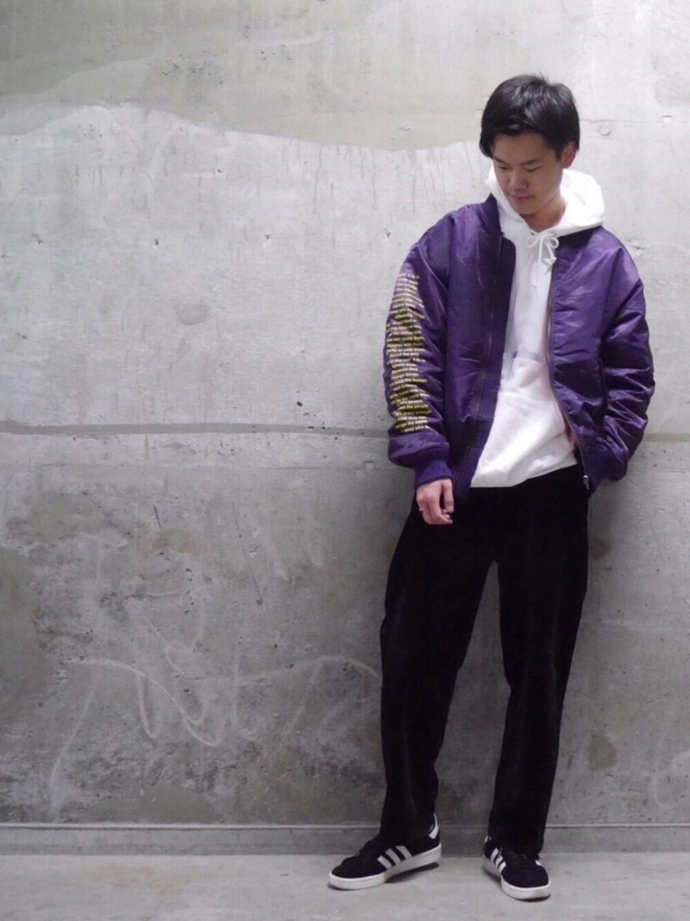 ご覧いただきありがとうございます! 珍しい紫のMA-1は羽織るだけで様になる🕺 ということでモノトーンに合わせてみました。 お気軽にいいね&フォローお願いします✔️