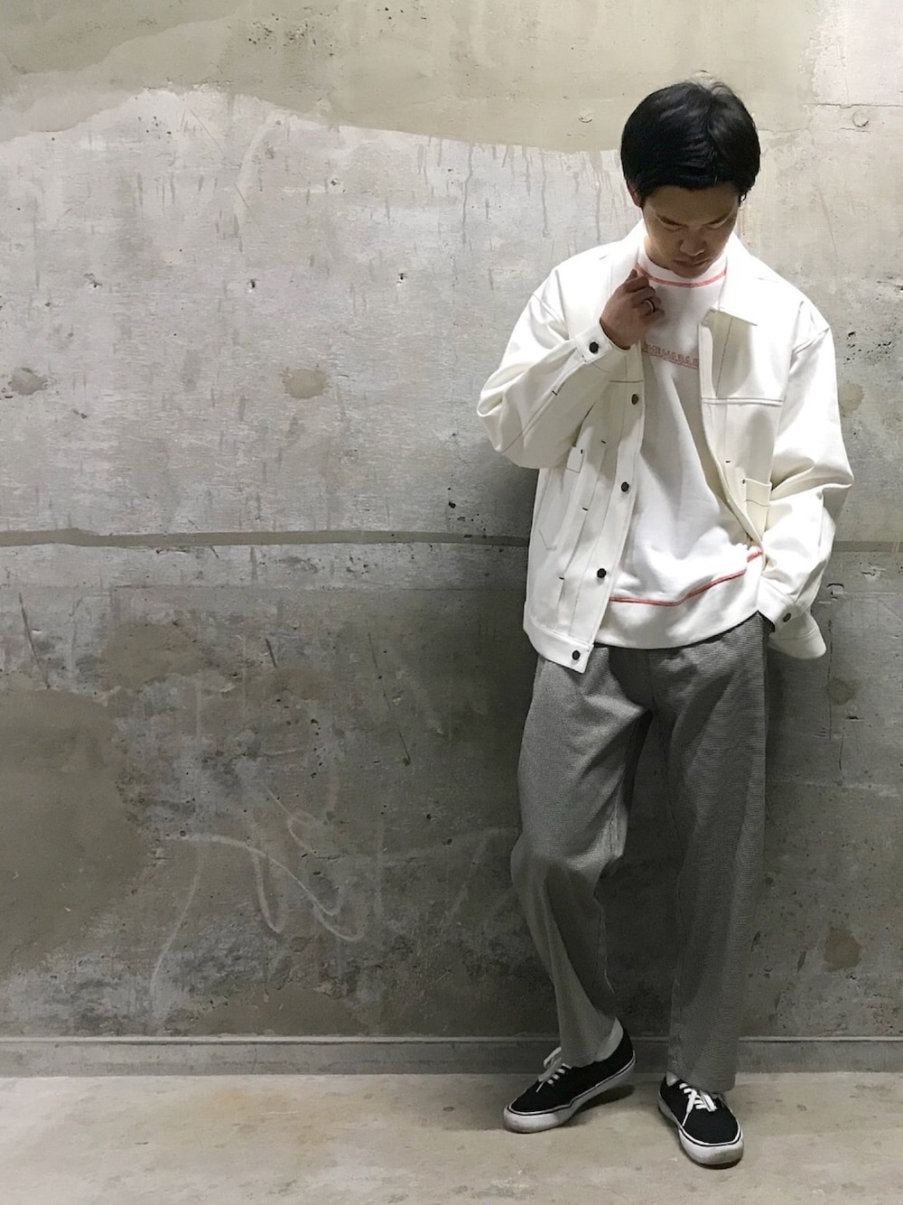 ご覧いただきありがとうございます! 今回は白のGジャン×スウェットに、千鳥チェックパンツの春スタイル🌸 モノトーンながら爽やかになるので、白×チェックオススメです🙆♂️