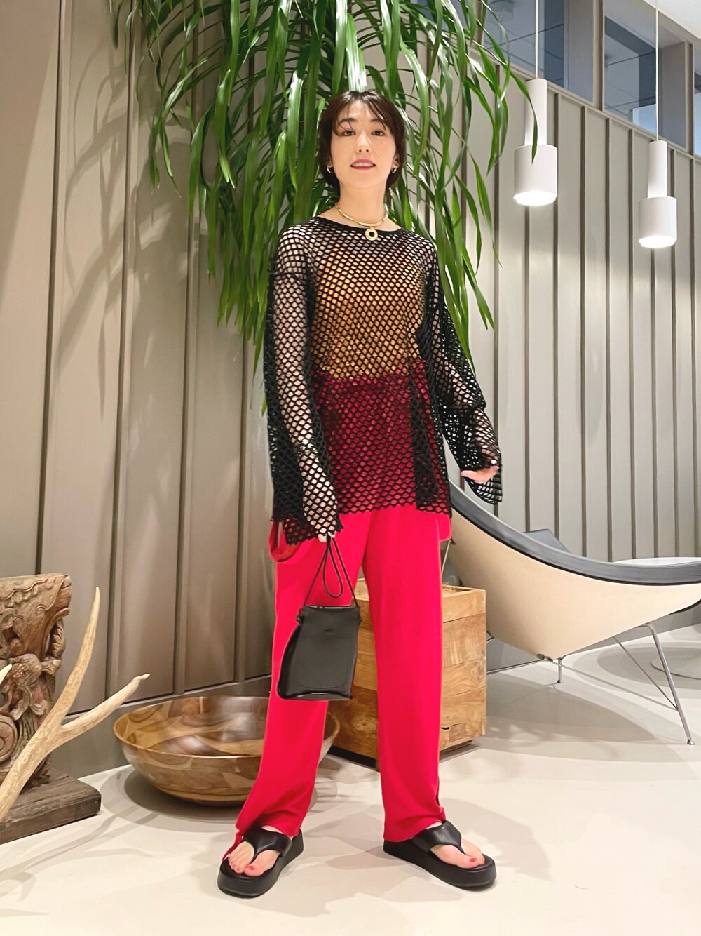 レイヤードスタイル簡単にできる、メッシュトップスがおすすめですよ!! 赤いパンツも絶対に欲しい!! 履き心地が最高です、、!
