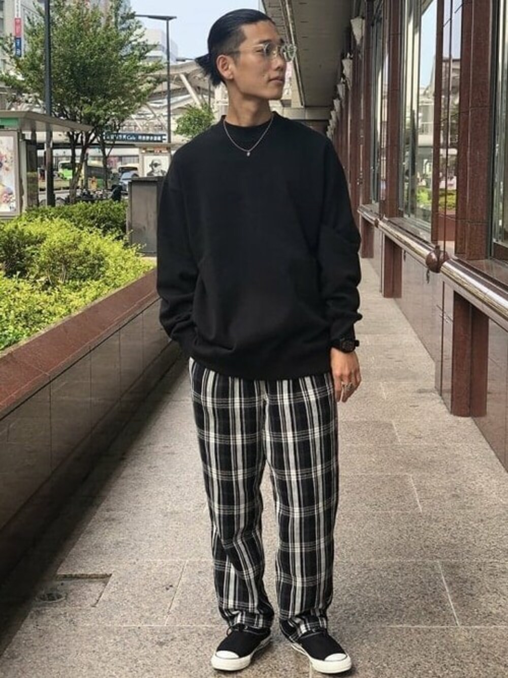 全身ブラックコーデが今の気分です。モックネックのスウェットをルーズめに着用。ネルチェックのパンツとシューズとも色を合わせて統一感を演出しています。 H:175cm