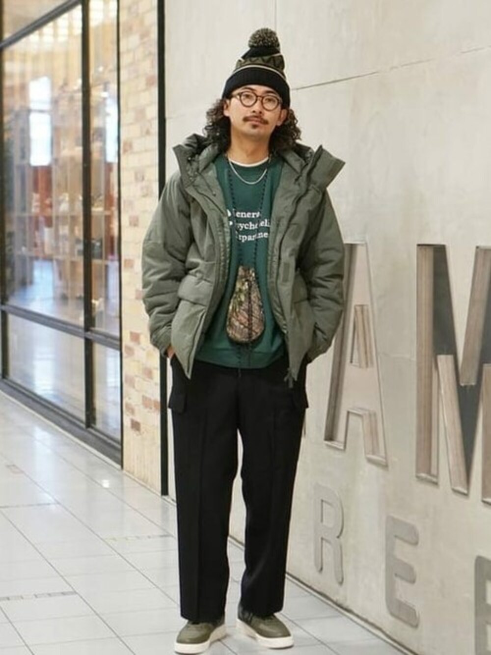 グリーンを基調にストリートスタイルです! パンツをブラックにする事でスタイリングにメリハリが効きます。