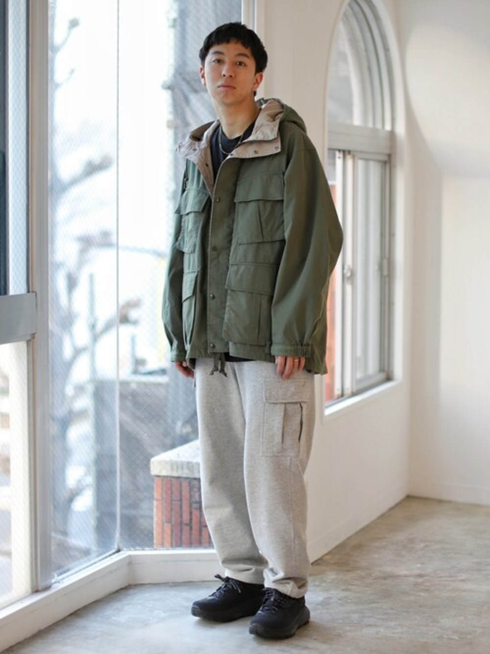 ミリタリー、アウトドア、スポーツ、ストリートと 様々なテイストをミックスしたスタイリング。 アウターはポケットが多く収納力に優れているだけでなく、 程よいルーズシルエットなので厚手のインナーでも気になりません。