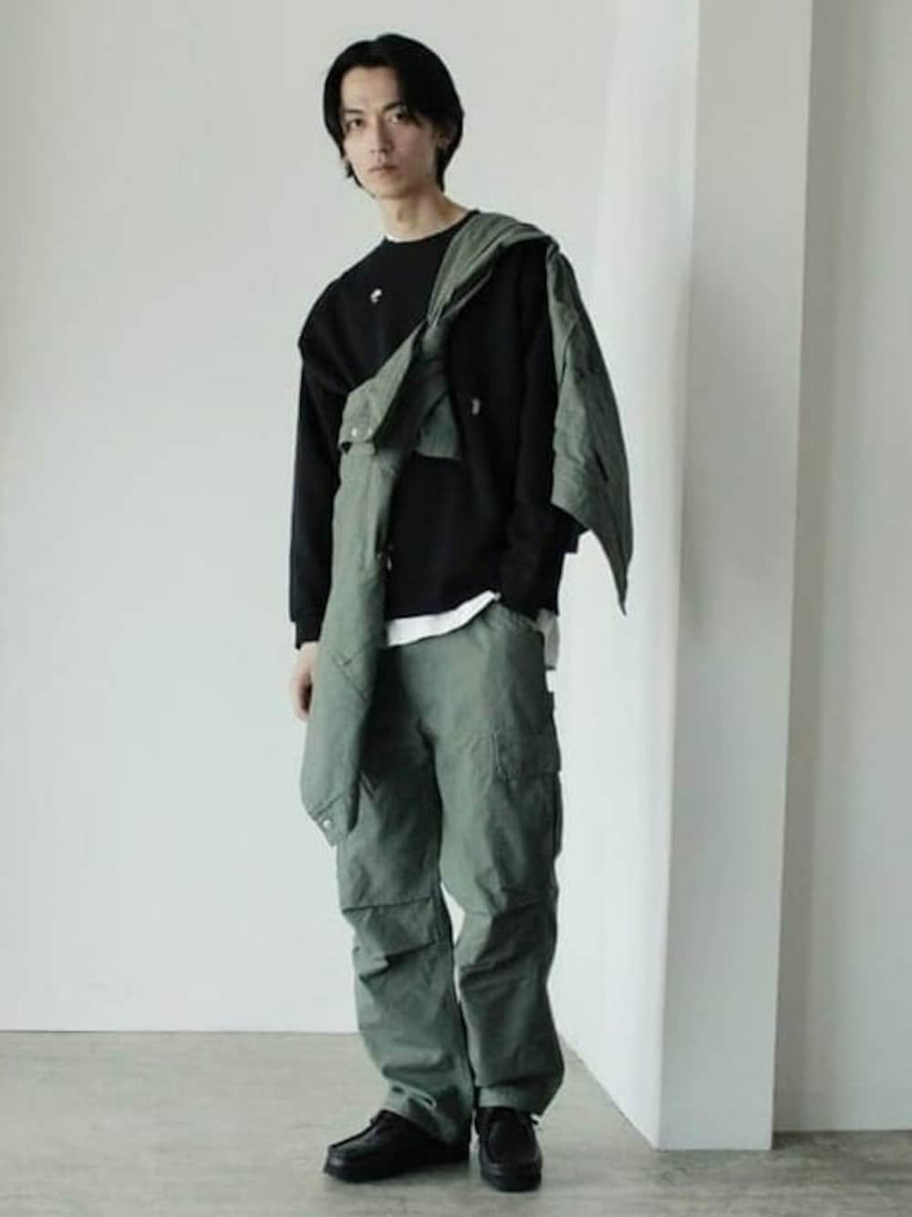 ミリタリーとワークを融合させた<UNIVERSAL OVERALL(ユニバーサルオーバーオール)>別注のセットアップ。<BEAMS(ビームス)>クラッシュスウェットで全体のテンションを合わせつつオリジナリティある着こなしを意識しました。ジャケット、パンツともに単体でも着回しが効きます。