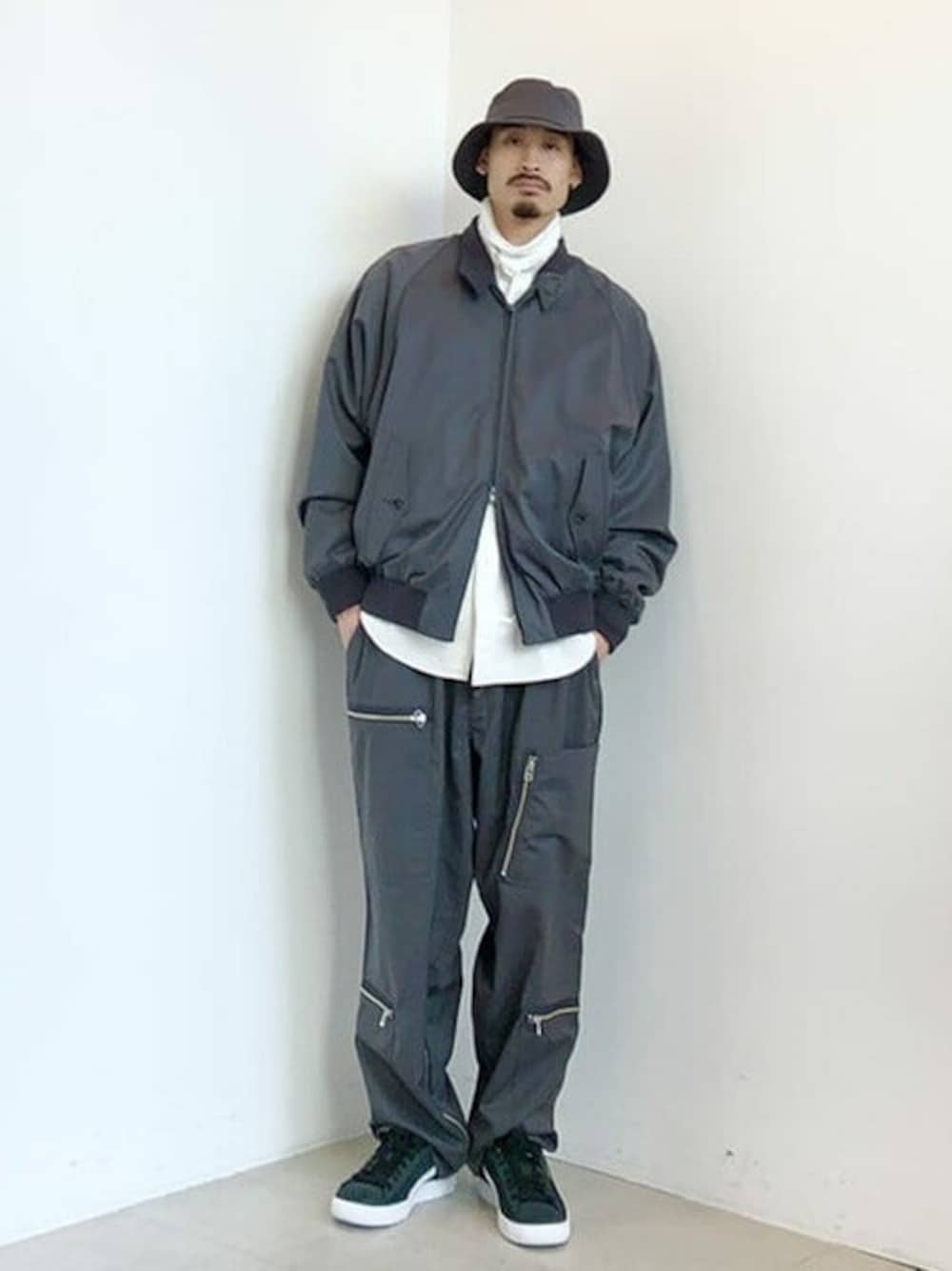 高級感のある軽やかな素材を使用し、ドックイヤーブルゾンを現代風にアップデートした<BEAMS>の新作を、共地のパラジュートパンツと合わたセットアップスタイル。 クラシカルな形ですがオーバーなサイズ感がトレンド感を演出します。 実用的なポケットワークにも注目していただきたいです。