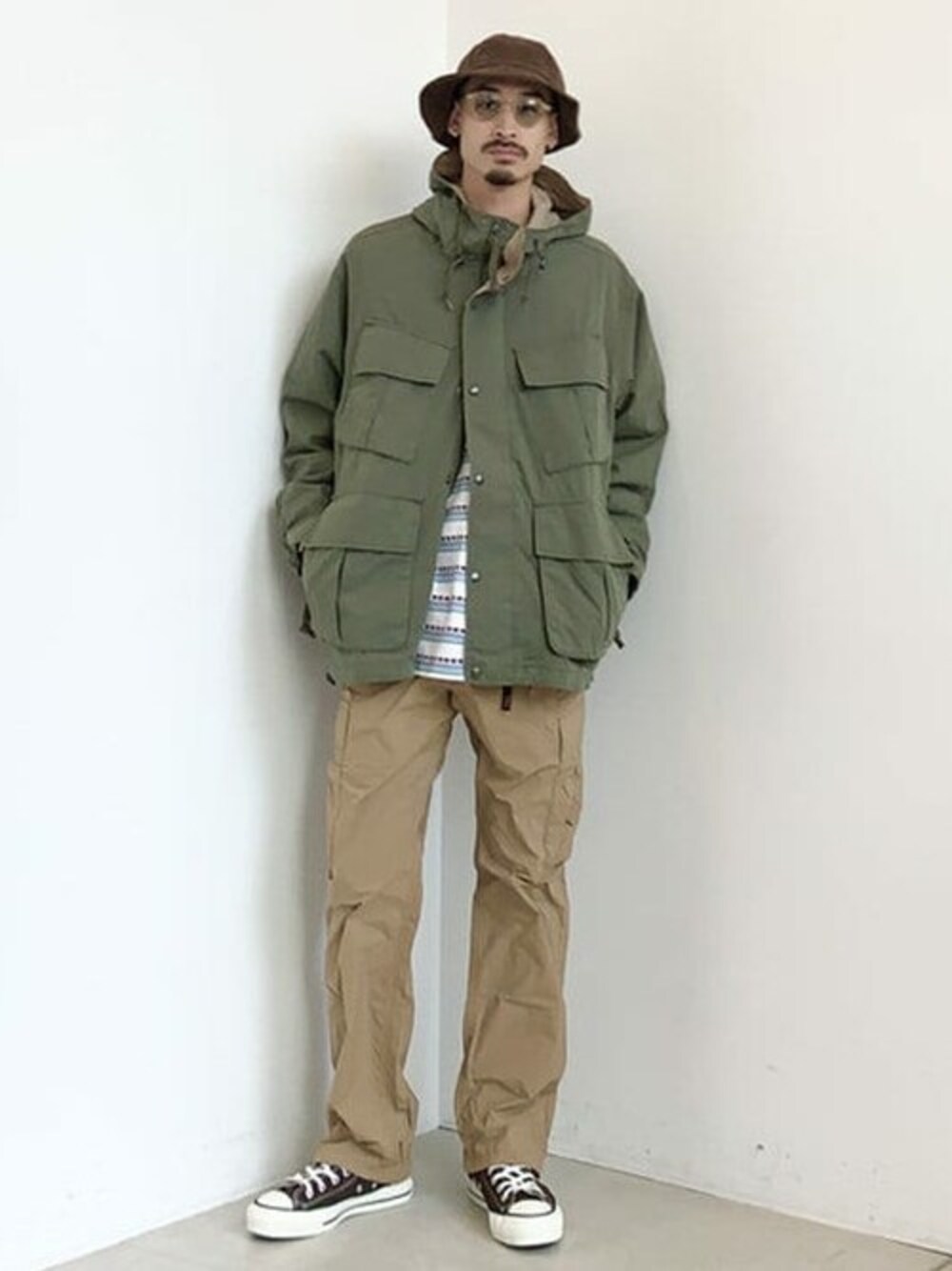 ルーズなシルエットの<BEAMS>のマウンテンパーカーと<GRAMICCI>別注ナイロンパンツを合わせました。 パンツがすっきりシルエットだったので馴染みの良いコンバースをチョイス。ナイスブラウンです。 インナーのボーダーTもおすすです。