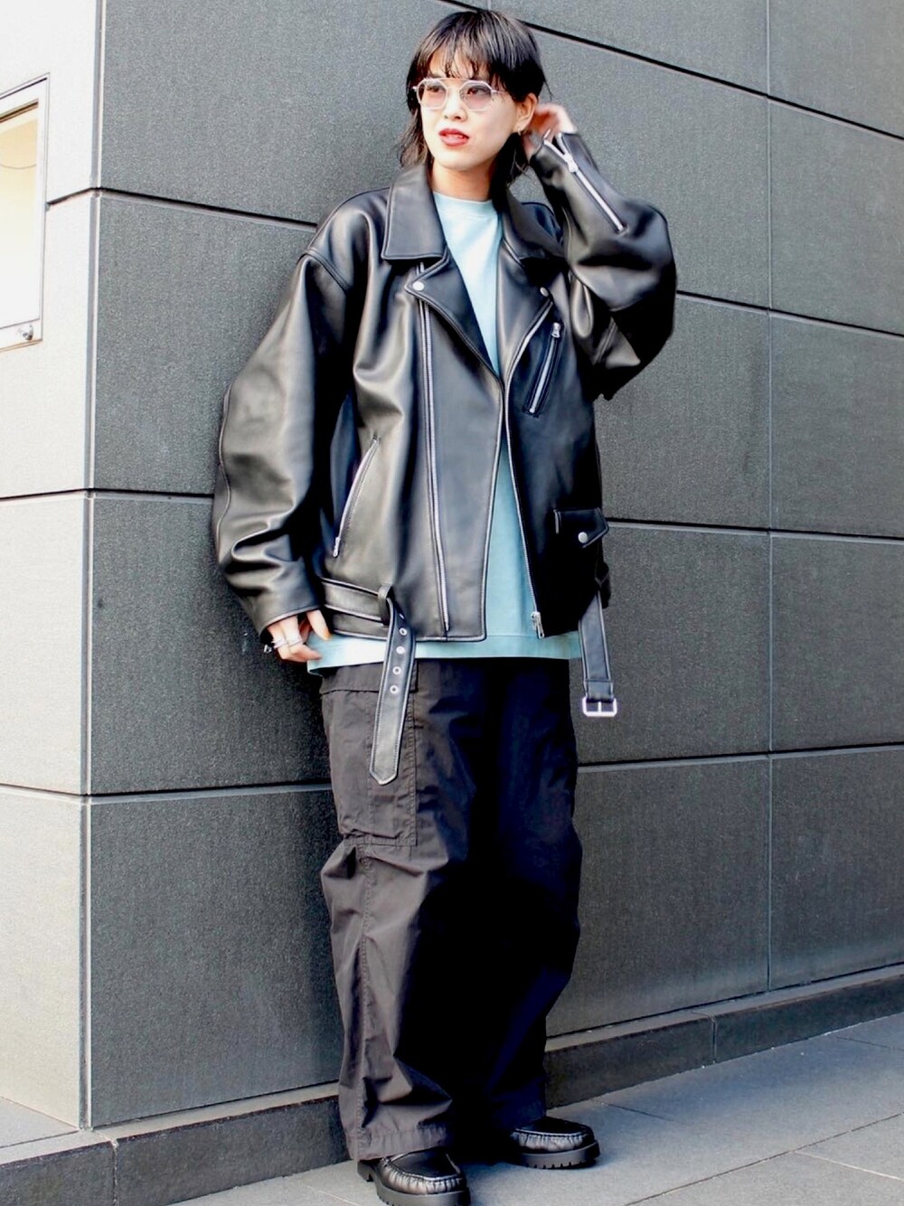 全身黒で差し色(ミントグリーン)を入れてスタイリングしました。<BEAMS >コールダイ ワイド クルーネックは特殊な染色で鮮やかな色がポイント。全体的にはミリタリーアイテムでゆったりとしたルーズシルエットにまとめて小物でクールに決めてみました。