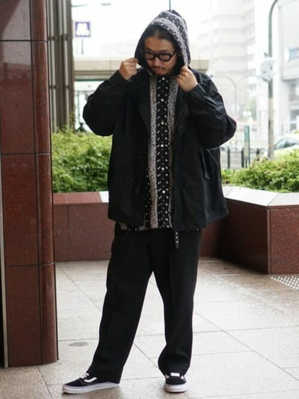 オールブラックスタイルにペイズリーでアクセント。サイズ感は全体的に大きめでルードな雰囲気に。