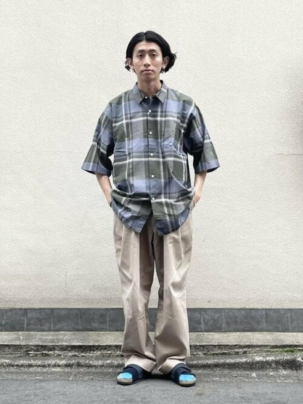 〈BEAMS〉のビッグシルエットのシャツは良いものが揃ってますよ。こちらはコットンシルク混紡のチェックシャツ。ルーズながら綺麗なラインで品があります。〈BIRKENSTOCK〉"KYOTO"とも相性抜群。