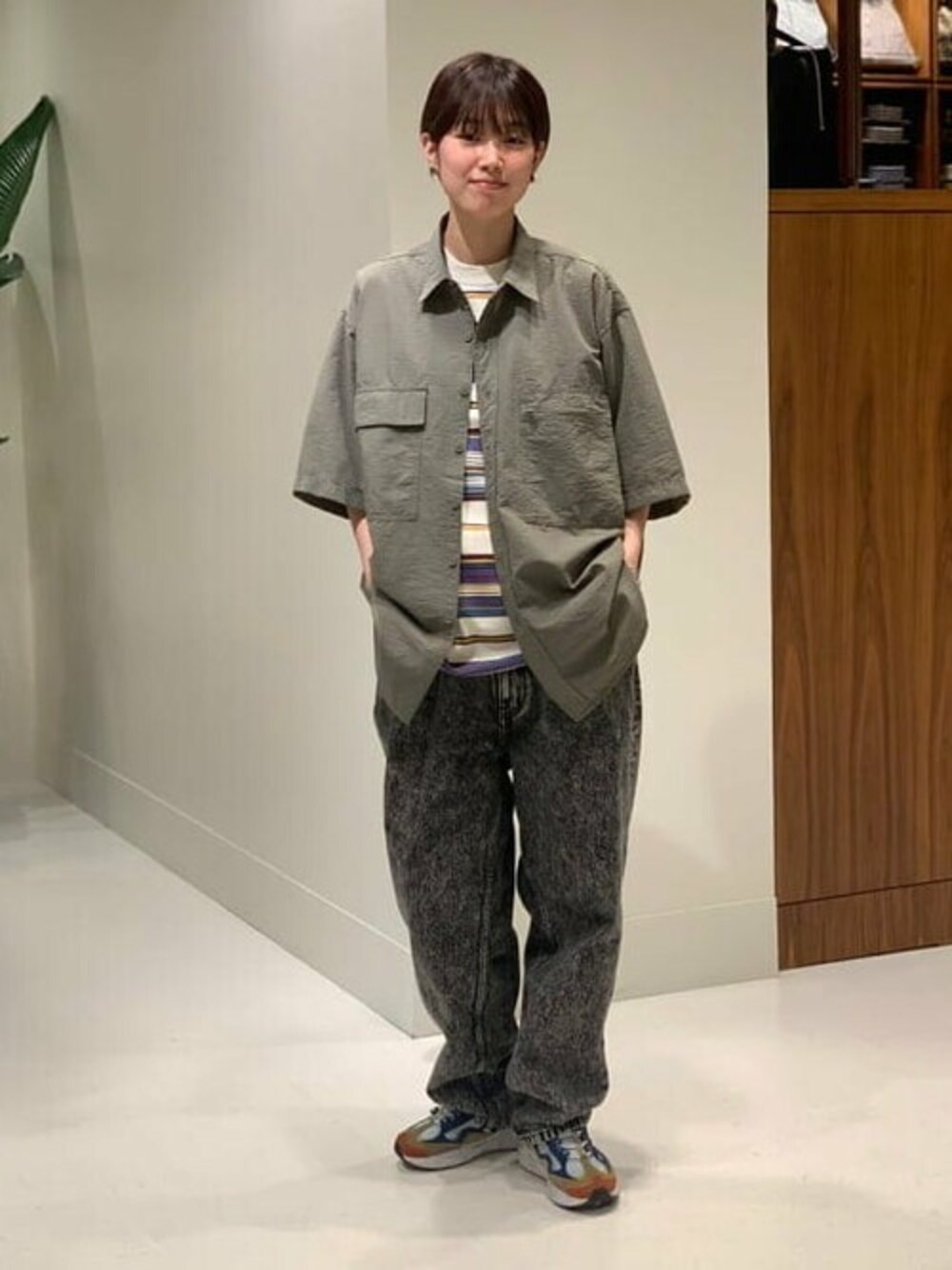 ゆったりとしたシルエットのシャツに、テーパードデニムを合わせて大きいだけじゃなく締まりを意識してバランスをとりました〜!通気性、ストレッチが抜群に効いたシャツなので夏場もめちゃくちゃ快適です◎