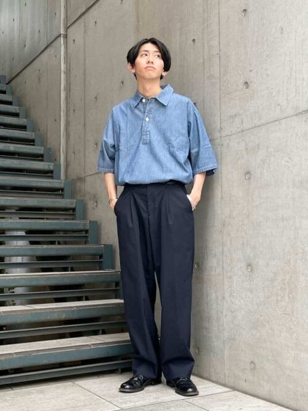 〈BEAMS〉のミリタリーのヴィンテージをデザインベースとしたプルオーバーシャツは一枚で様になります。タックインした雰囲気も好きです。インナーに着ている〈BEAMS〉のフェードTシャツも古着感のある雰囲気が最高です。