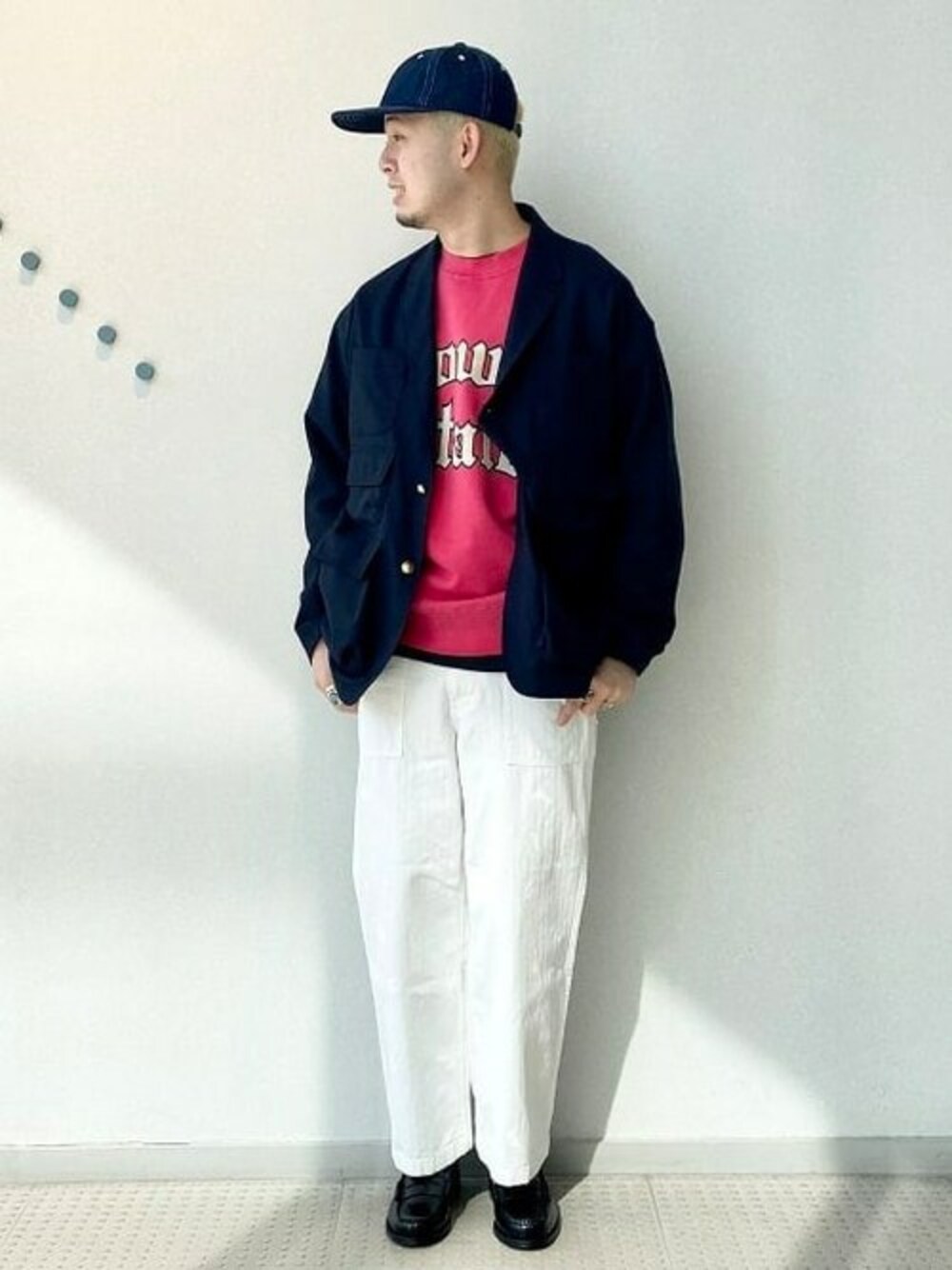 【アイビー】ライクなコーディネートです!インナーのスウェットがポイントですが、白のパンツで印象を爽やかにしてみました! ビームス 名古屋 / 鈴木 大貴
