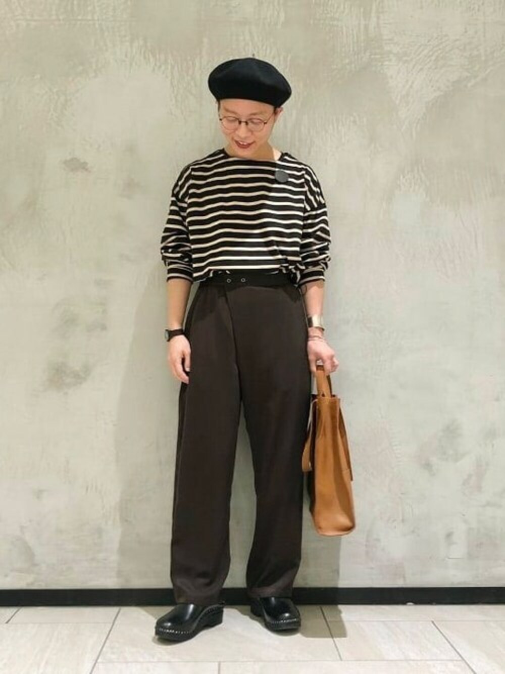 <AUBERGE>のトップスは、ゆったりしたサイズ感ゆえに、パンツにインしたり袖を捲った時にできる生地の溜まり具合がとても素敵です。合わせた<maturely>のパンツは、ウエストゴムで楽〜に履けるのに、きれい見えする優秀アイテム。 BEAMS 立川 / 土田 達也